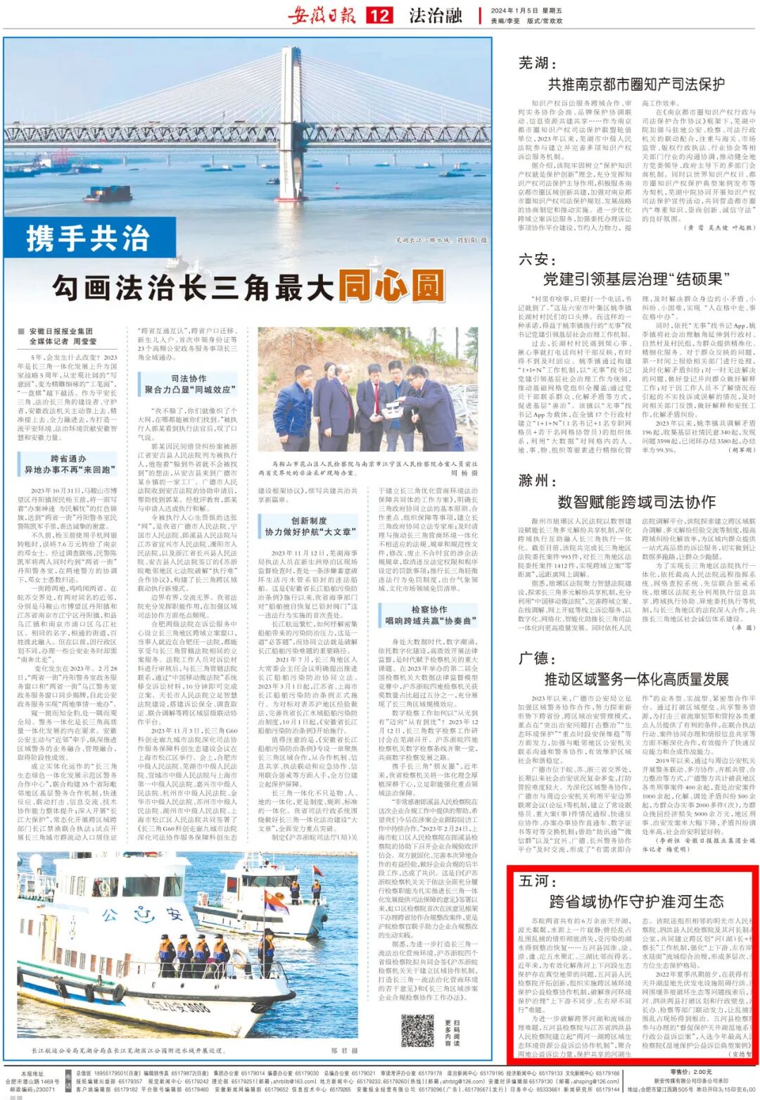 为进一步破解跨界河湖和流域治理难题,五河县检察院与江苏省泗洪县人民检察院建立起“两河一湖跨区域生态环境资源公益诉讼协作机制”,聚合两地公益诉讼力量,保护共享的河湖生态。该院还组织相邻的明光市人民检察院、泗洪县人民检察院及其河长制办公室,共同建立跨区划“河(湖)长+检察长”工作机制,强化“上下游、左右岸、水陆面”流域综合治理,形成多层次、全方位生态保护格局。