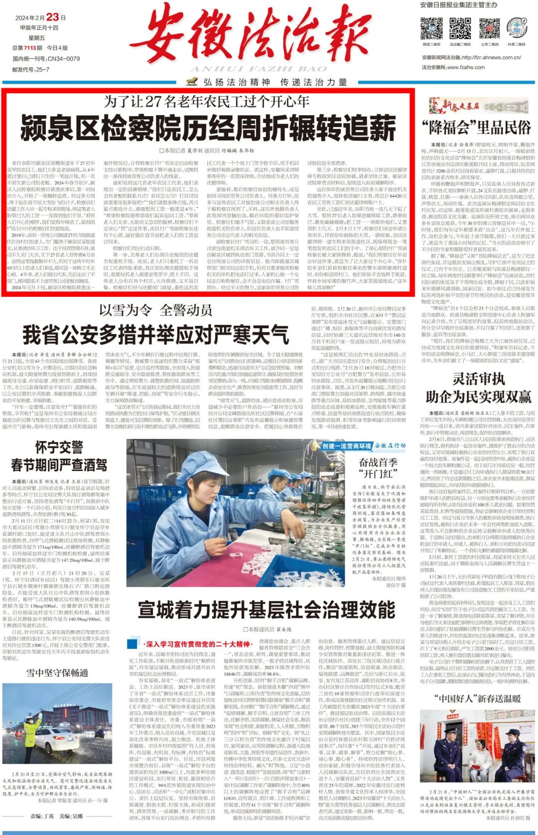来自阜阳市颍泉区周棚街道乡下27名年过花甲的农民工,他们大多是老弱病残,从4年前就讨要自己清扫卫生的一笔血汗钱,但一直找不到欠薪公司的老板。2024年春节前夕,颍泉区人民检察院检察官获悉此事后,第一时间依法介入,开始了一场辗转追查。经过多方周折,终于赶在春节前大雪纷飞的日子,检察官们携法援工作人员一起专程来到现场,将这笔老人们盼望已久的工资一一发放到他们手里。“看到老人们开心的模样,我们觉得年味浓了,累得值了!”风尘仆仆的检察官们欣慰地说。