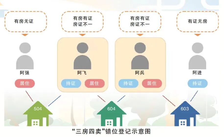 至此,阿欣、阿霞夫妇“三房四卖”,相关房产阴差阳错被登记在不同业主名下的事实得以查清。作为利害关系人,实际购买并居住在504室的阿强自然无法再办理房产登记手续。