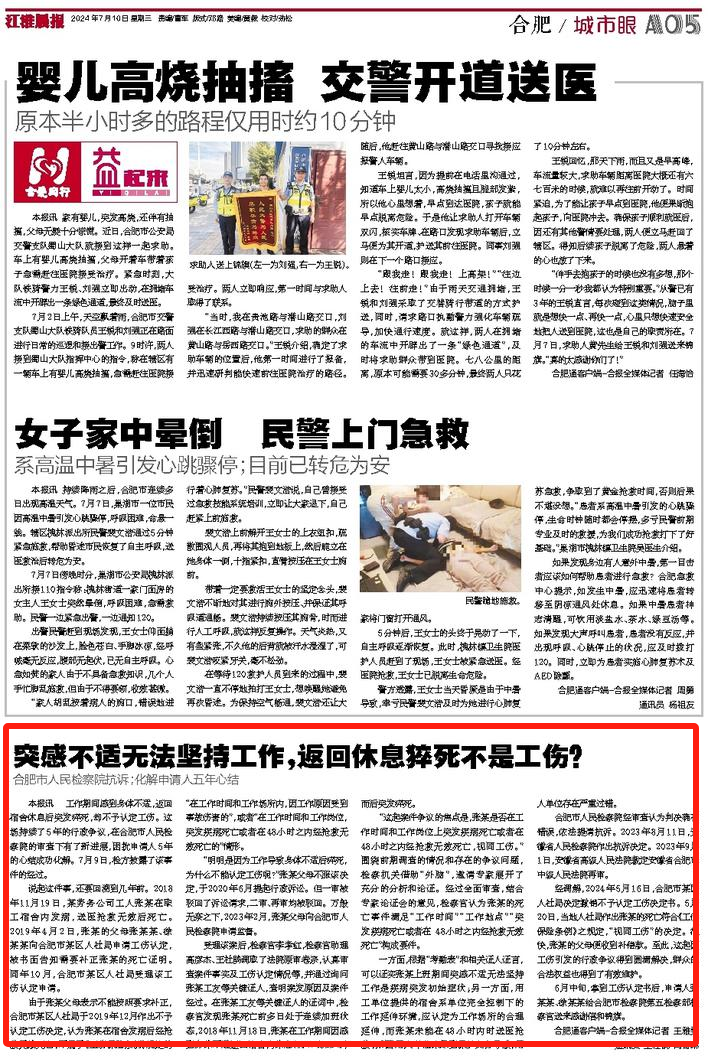 工作期间感到身体不适,返回宿舍休息后突发猝死,却不予认定工伤。这场持续了5年的行政争议,在合肥市人民检察院的审查下有了新进展,困扰申请人5年的心结成功化解。7月9日,检方披露了该事件的经过。