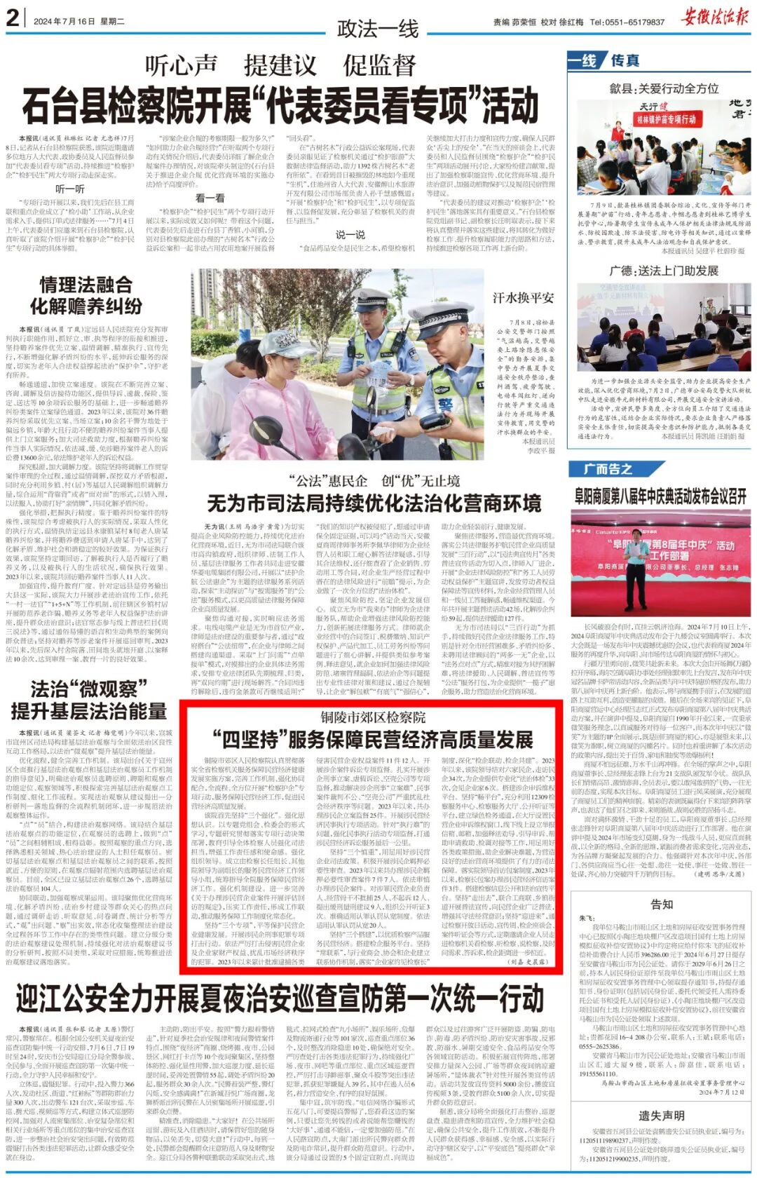 铜陵市郊区人民检察院认真贯彻落实全省检察机关服务保障民营经济健康发展实施方案,完善工作机制、强化协同配合,全流程、全方位开展“检察护企”专项行动,服务保障民营经济工作,促进民营经济高质量发展。