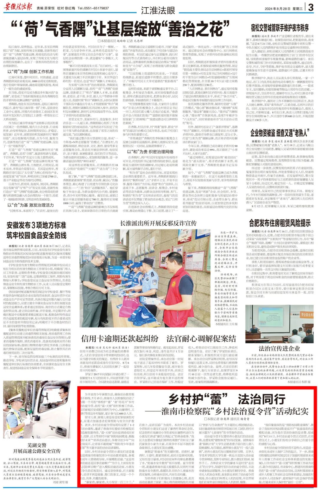 为丰富青少年暑期生活,确保法治教育假期不掉线,7月15日,淮南市人民检察院启动了为期一个月的“淮检护‘蕾’ ‘童’待花开”乡村法治夏令营,依托“蓝·天使”驻村检察工作站,以田家庵区安成镇沿淮村为中心,向廖湾村、王巷村等周边乡村辐射,累计参与达600余人次。