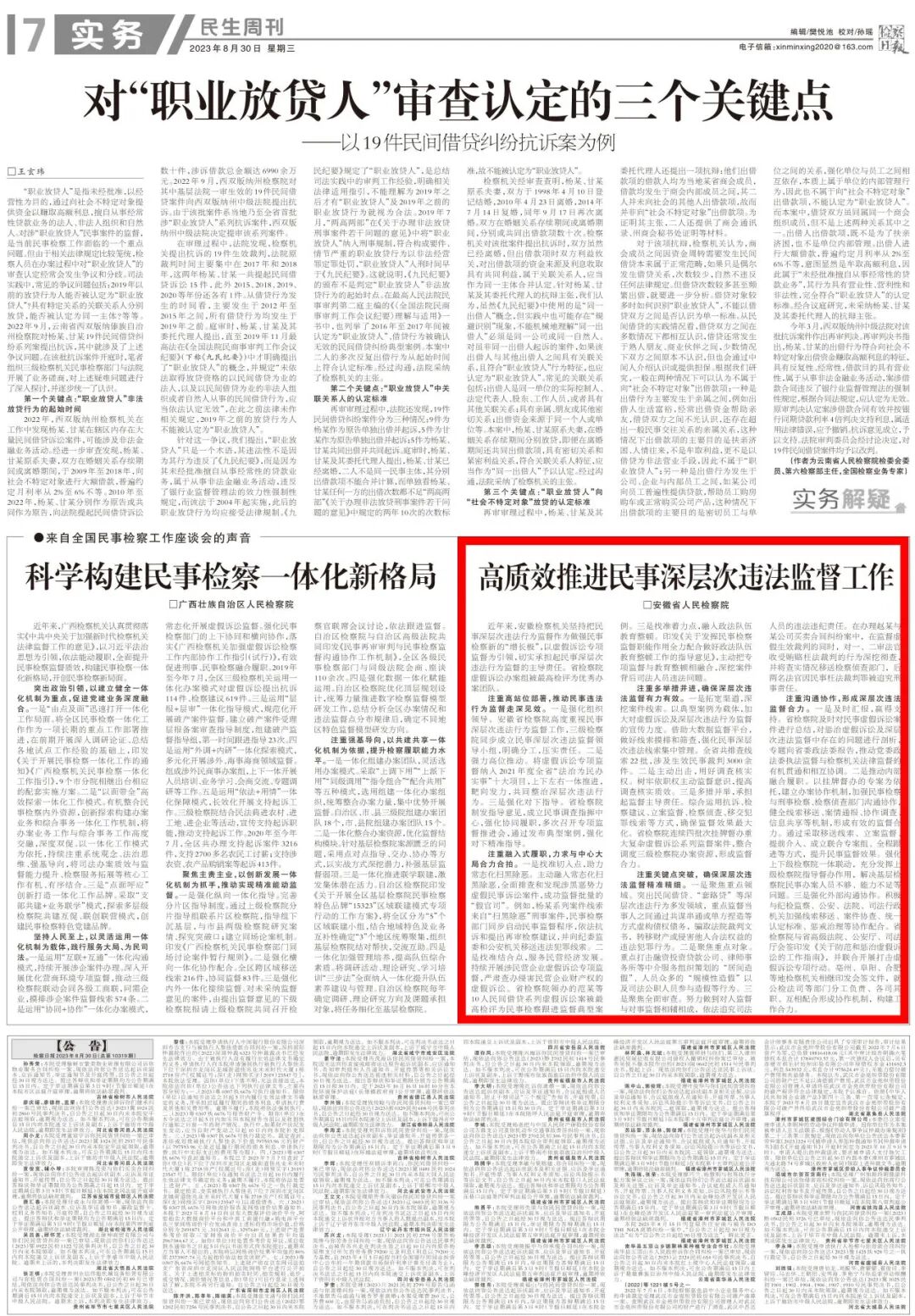 注重融入式履职,力求与中心大局合力合拍。一是找准切入点,助力常态化扫黑除恶。主动融入常态化扫黑除恶,全面排查和发现涉黑恶势力虚假民事诉讼案件,成功监督批量的“假官司”。例如,杨某系列案件线索来自扫黑除恶刑事案件,民事检察部门同步启动民事监督程序,依法抗诉和提出再审检察建议,并向纪委监委和公安机关移送违法犯罪线索。二是找准结合点,服务民营经济发展。持续开展涉民营企业虚假诉讼专项监督,严肃查办侵害民营企业财产权的虚假诉讼。省检察院领办的范某等10人民间借贷系列虚假诉讼案被最高检评为民事检察跟进监督典型案例。三是找准着力点,融入政法队伍教育整顿。印发《关于发挥民事检察监督职能作用全力配合做好政法队伍教育整顿工作的指导意见》,主动把专项监督与教育整顿相融合,深挖案件背后司法人员违法问题。