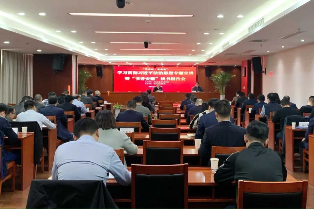 根据安徽省委讲师团“举旗帜·送理论”学习贯彻习近平法治思想专题宣讲暨“书香安徽”读书报告会安排,11月23日,安徽省检察院党组成员、副检察长陶芳德应邀为安徽省生态环境集团宣讲习近平法治思想。安徽省生态环境集团党委副书记、工会主席杨晓彬主持报告会。