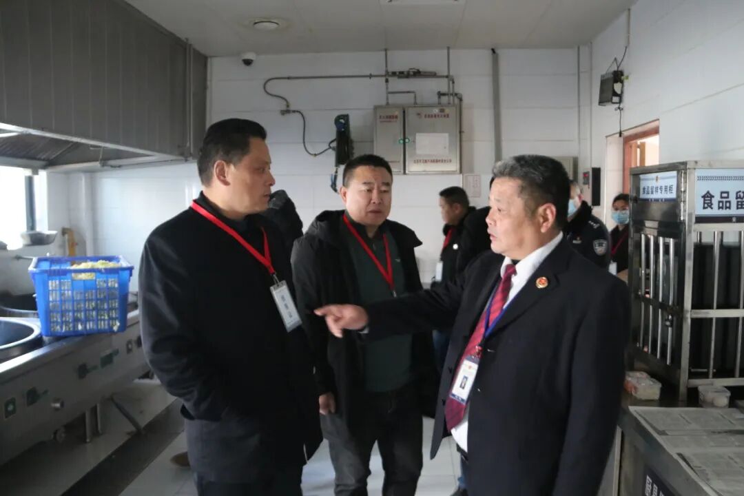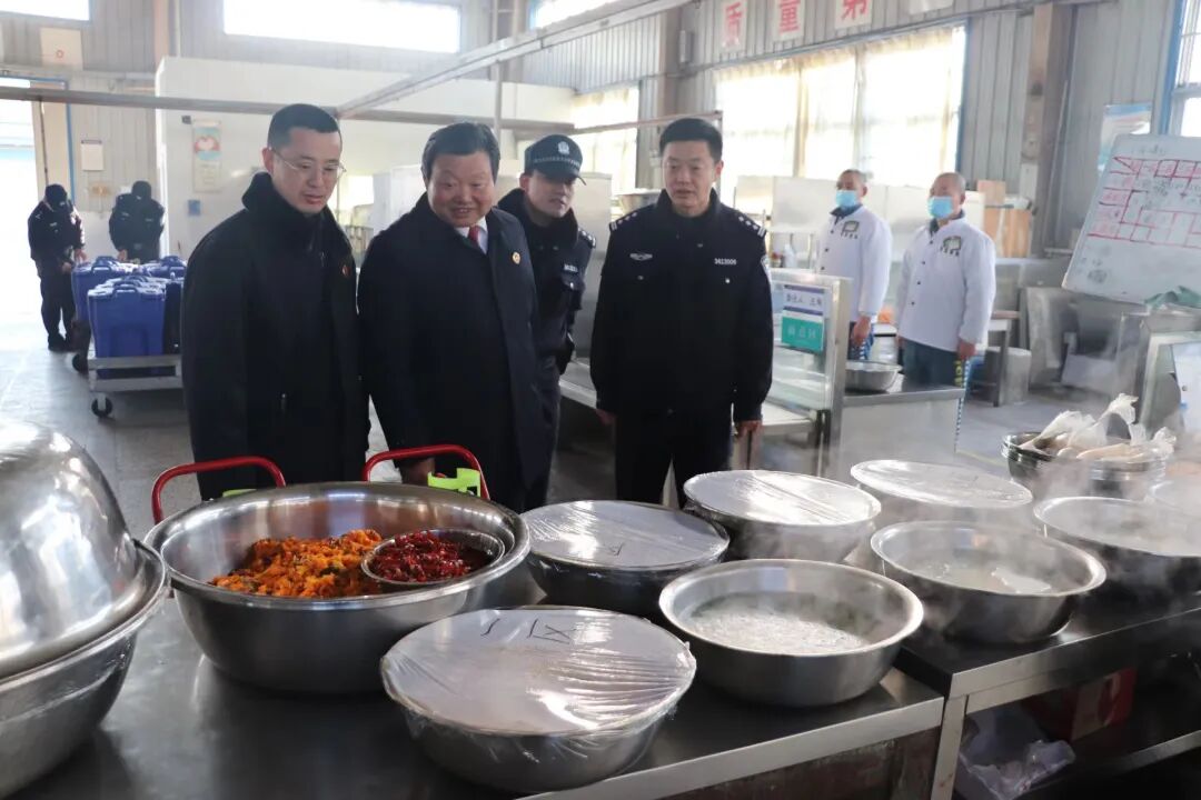 ▲安徽省检察院党组成员、副检察长刘曙光(中)在合肥监狱察看食堂食品卫生状况。
