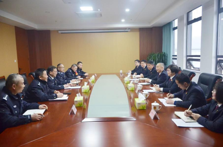 ▲安徽省铜陵市检察院检察长杨开江(右四)与铜陵监狱会商监管安全工作。