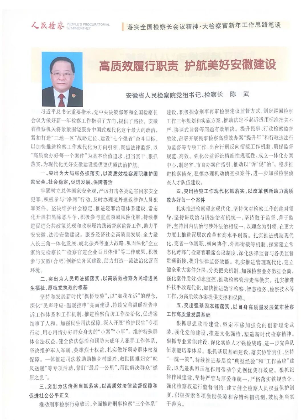 习近平总书记重要指示、党中央决策部署和全国检察长会议为做好新一年检察工作指明了方向,提供了路径。安徽省检察机关将紧紧围绕服务中国式现代化这个最大的政治,紧扣打造“三地一区”战略定位、建设“七个强省”奋斗目标,以加快推进检察工作现代化为方向引领,聚焦法律监督,以“高质效办好每一个案件”为基本价值追求,担当实干、狠抓落实,为现代化美好安徽建设提供更优质法治护航。