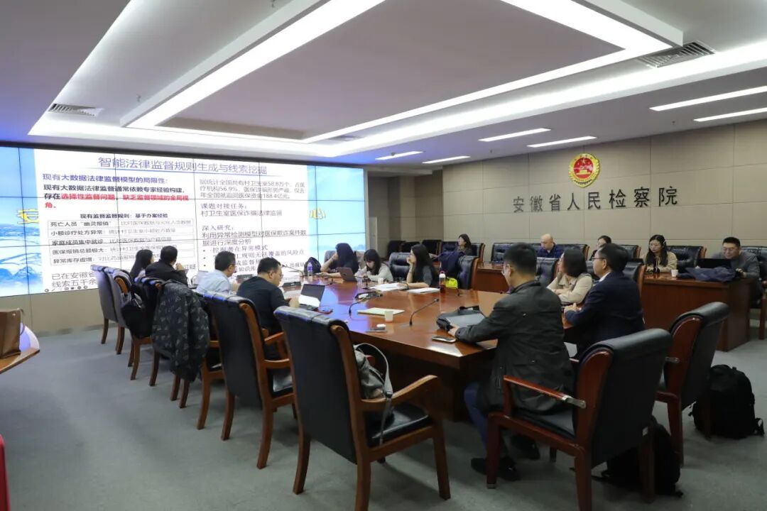 在合肥市检察院,项目组听取了合肥市检察机关数字检察总体情况,庐阳区检察院、蜀山区检察院分别展示创新法律监督模型并汇报数字检察工作情况,调研组围绕法律监督模型数据获取及监督规则、模型在社会治理领域的应用等方面问题进行深入调研。