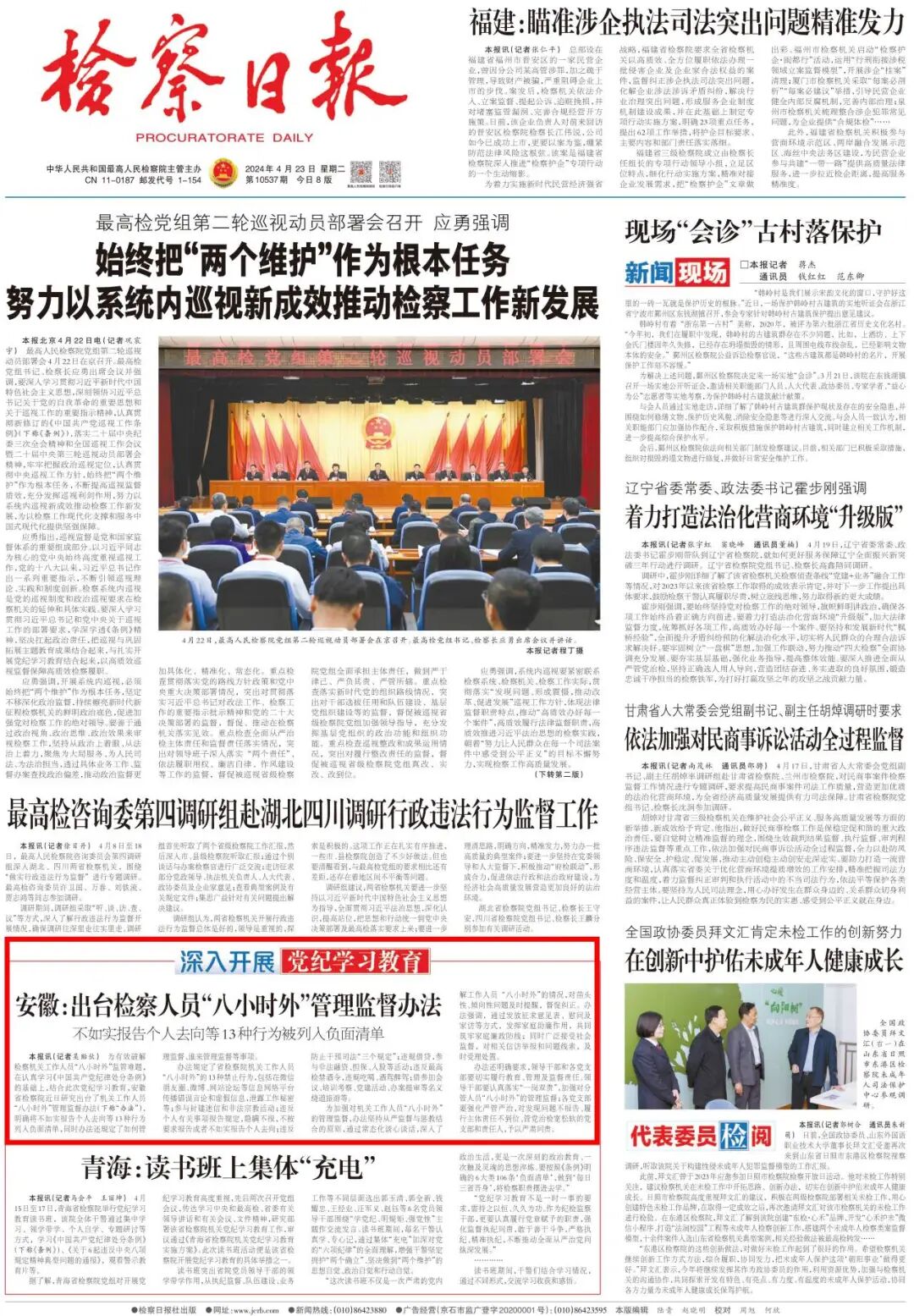 为有效破解检察机关工作人员“八小时外”监管难题,在认真学习《中国共产党纪律处分条例》的基础上,结合此次党纪学习教育,安徽省检察院近日研究出台了机关工作人员“八小时外”管理监督办法(下称“办法”),明确将不如实报告个人去向等13种行为列入负面清单,同时办法还规定了如何管理监督、谁来管理监督等事项。