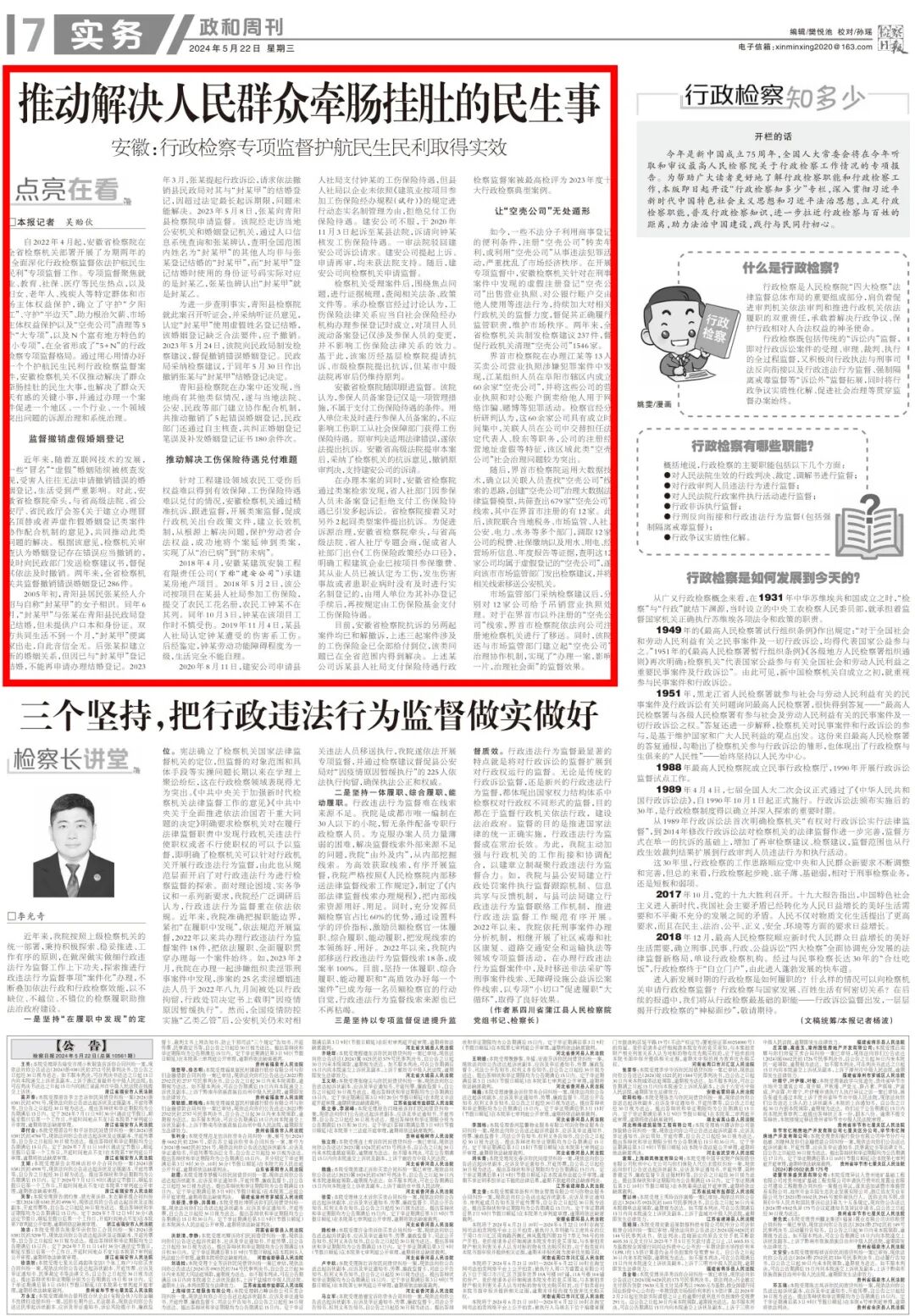 通过用心用情办好一个个护航民生民利行政检察监督案件,安徽检察机关不仅推动解决了群众牵肠挂肚的民生大事,也解决了群众天天有感的关键小事,并通过办理一个案件促进一个地区、一个行业、一个领域突出问题的诉源治理和系统治理。