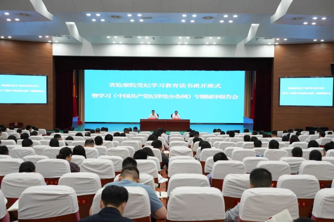安徽省纪委监委六室副主任汪赵华应邀作了专题辅导报告。安徽省检察院领导、检委会专职委员,二级巡视员、二级高级检察官,省院党纪学习工作专班各组负责同志、机关各内设机构主要负责人、派出院检察长全程参加读书班学习。安徽省检察院机关及派出院全体干警、离退休干部代表参加了开班学习。