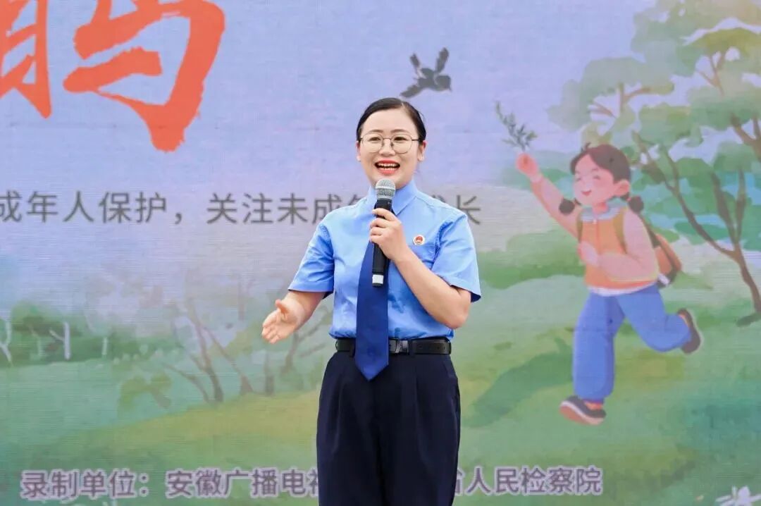合肥市包河区人民检察院第三检察部检察官助理程灿萍,将广播剧《喜鹊》中小主人公们遇到的问题抛给了现场的孩子们,一问一答中也将孩子们带入了一场“互动式”的普法教学中。