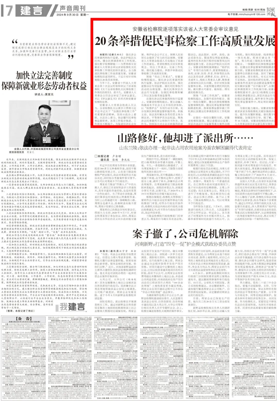 强化涉企民事裁判和执行监督,依法护航民生民利,健全民事调查核实工作机制,强化数字检察赋能……为贯彻落实安徽省人大常委会审议该省检察机关民事检察工作情况的报告意见,全力推进民事检察工作高质量发展,安徽省检察院经逐项研究,于近日有针对性地提出20条具体举措。