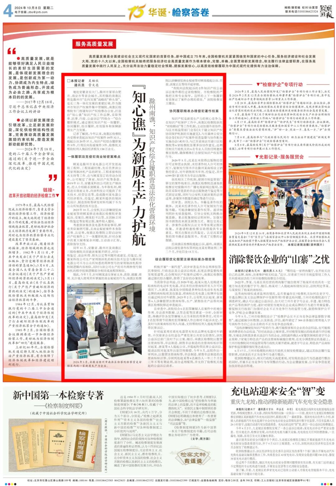 知识产权是新质生产力的核心竞争力,在知识产权保护工作中,南谯区检察院依托“府检联动”等工作机制,主动加强外部协作,与区市场监管部门会签《关于建立知识产权协同保护机制的实施意见》,与市森林公安分局会签《知识产权案件侦查监督与协作配合实施办法(试行)》,与江苏省南京市浦口区检察院等6家检察院签署多份协作意见,还聘任相关行政机关的6名专业人员担任特邀检察官助理,确保精准打击侵犯知识产权犯罪行为。