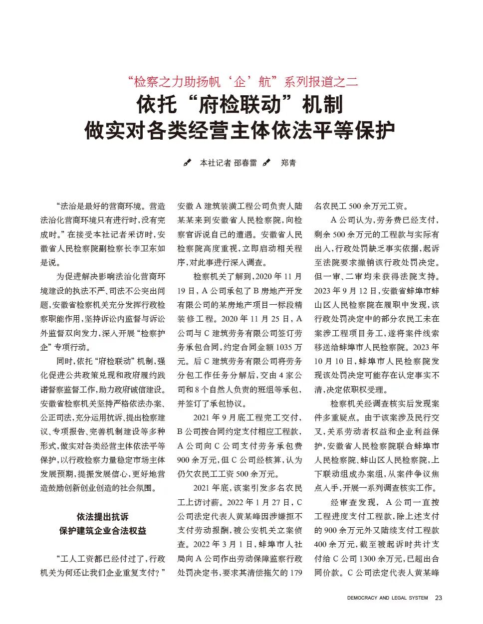 据悉,安徽省人民检察院还依托“府检联动”机制,先后制定《安徽省检察机关助推民营经济高质量发展十大举措》《关于进一步改进工作作风打造一流法治化营商环境的实施意见》等规范性文件,明确政府机关、检察机关共同探索行政违法行为整治、依法兑现公共政策、着力化解涉企行政争议等具体工作。与此同时,安徽省人民检察院抓住发展机遇,制定《安徽省人民检察院关于全面做大做强行政检察工作的意见》,进一步细化工作任务,推动“府检联动”机制优势转化为全省行政检察工作效能。
