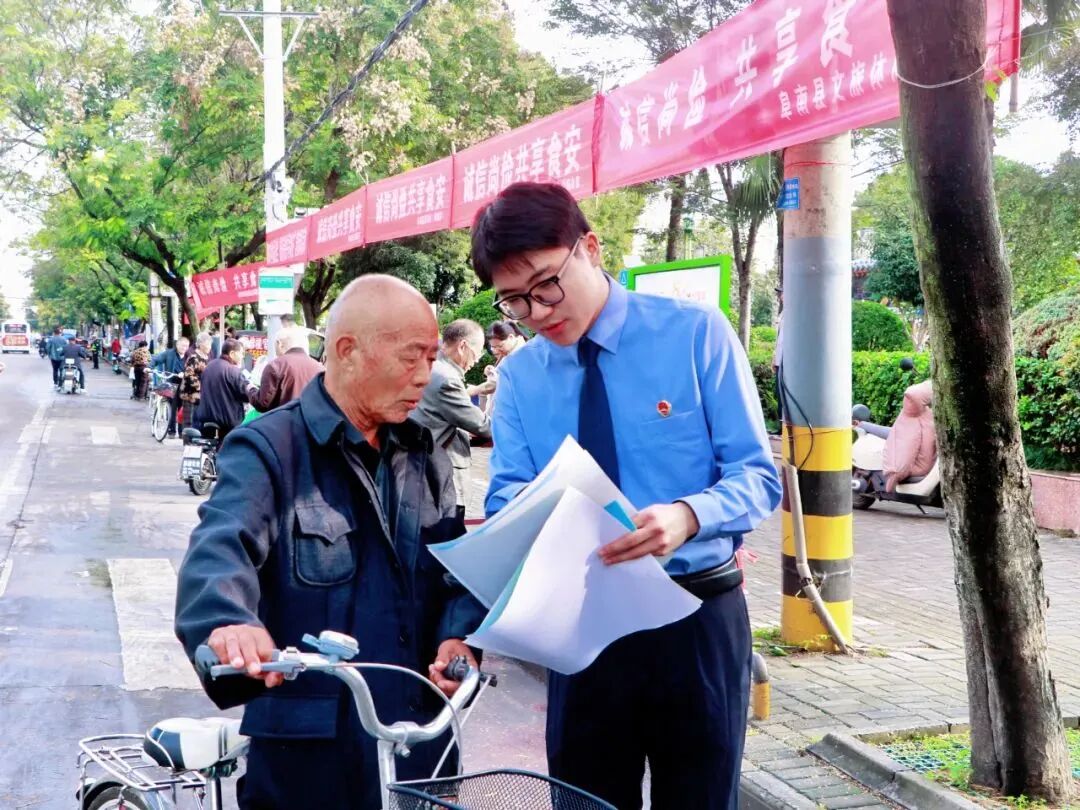10月18日,阜阳市阜南县检察院围绕“诚信尚俭 共享食安”主题,在鹿城镇街心公园开展食品安全宣传周活动。活动现场,检察干警现场解答群众疑问,以案释法、以案为鉴,向群众普及食品安全知识及食品安全法律法规、文明餐饮等相关知识,引导群众树立科学饮食、崇尚节俭、文明就餐的观念,提升群众识假辨假的能力和依法维权的意识,共同守护食品安全防线。