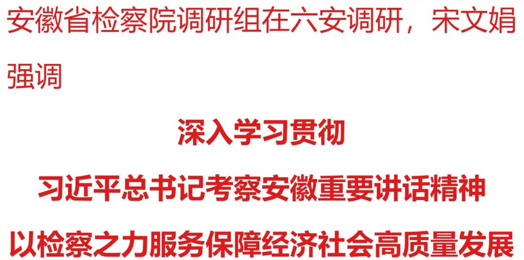 调研中,宋文娟对六安检察工作给予充分肯定。她指出,全省检察机关要把学习贯彻习近平总书记考察安徽重要讲话精神作为当前和今后一个时期的重大政治任务,坚持学思践悟一体贯通,在学习上入脑入心,在贯彻落实上到底到边,在结合转化上走深走实,紧密结合“三地一区”战略定位和“实现‘六个新提升’、做到‘六个当先锋’”改革目标,做深做实“检察护企”“检护民生”专项行动,助力打造一流法治化营商环境,扎实护航重点领域改革,切实加强“三农”发展司法保障。