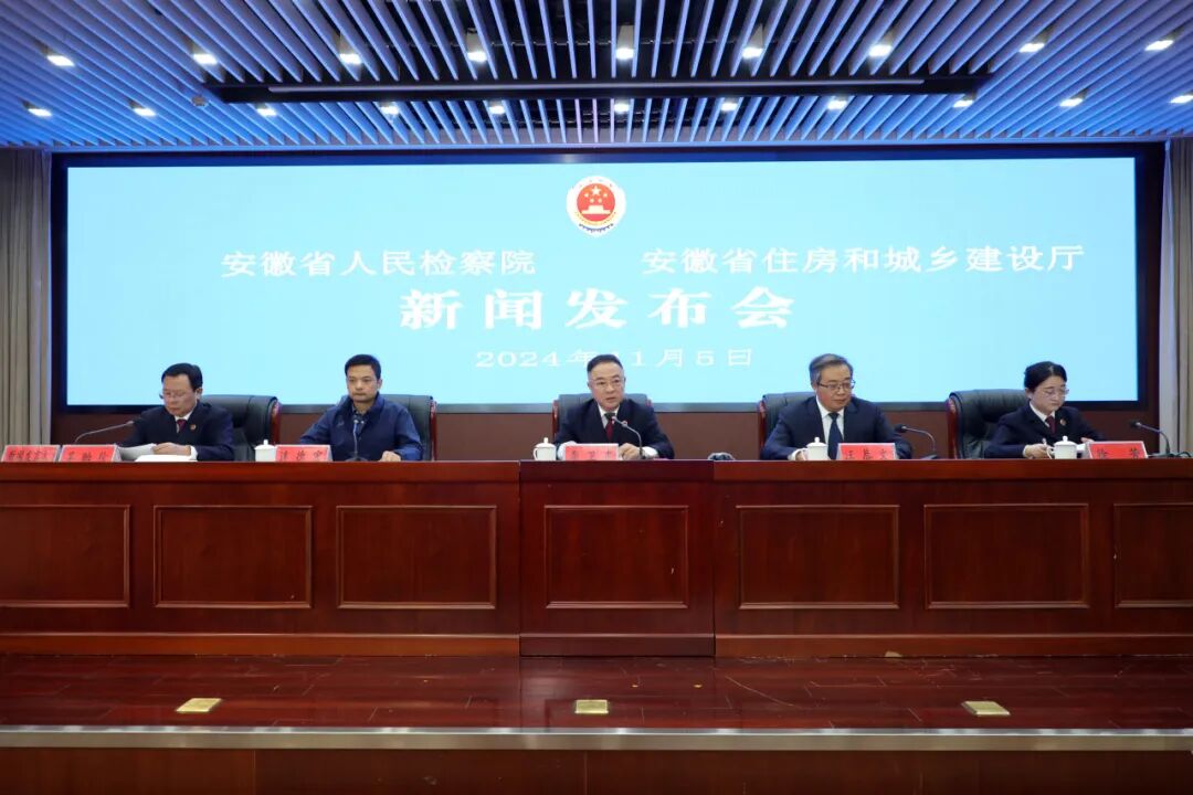 安徽省检察院、省住房和城乡建设厅有关部门负责人、典型案例承办人参加发布会。中央驻皖暨安徽省新闻单位的记者出席发布会。