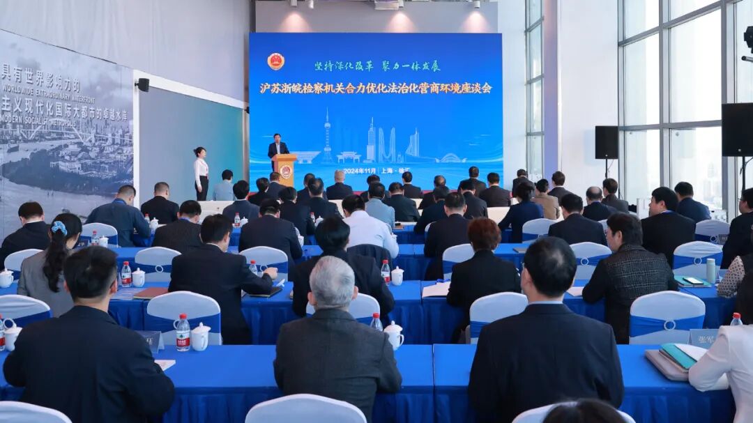 11月12日,“坚持深化改革 聚力一体发展——沪苏浙皖检察机关合力优化法治化营商环境”座谈会在上海召开。会议深入学习贯彻习近平总书记考察上海重要讲话精神和深入推进长三角一体化发展座谈会精神,聚焦深入推进长三角一体化发展国家战略与法治化营商环境建设工作紧密对接、深度融合,共谋以高质效检察履职服务发展新质生产力的新路径。最高人民检察院党组副书记、常务副检察长童建明,上海市委副书记、市委政法委书记朱忠明出席会议并致辞。上海市人民检察院党组书记、检察长陈勇,江苏省人民检察院党组书记、代理检察长赵铁实,浙江省人民检察院党组书记、检察长林贻影,安徽省人民检察院党组书记、代理检察长宋文娟会签文件并作主旨发言。