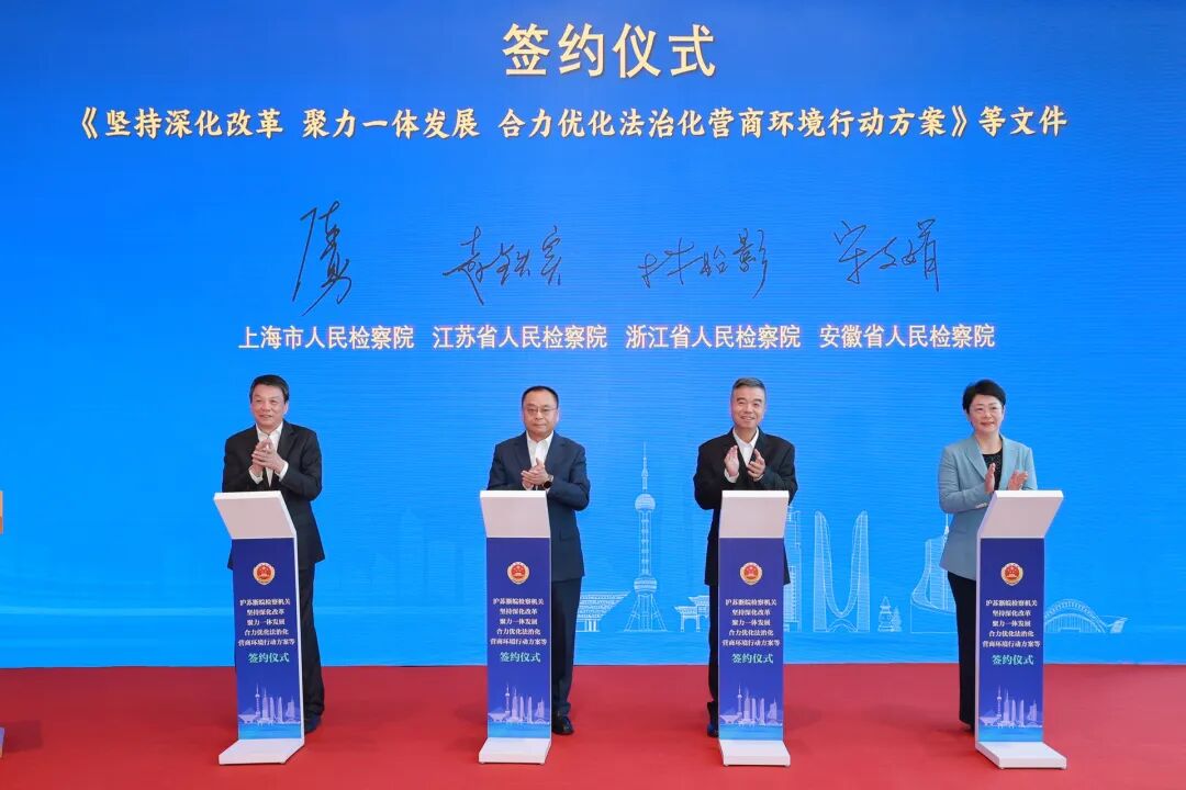 四地省级人民检察院共同会签了《沪苏浙皖检察机关坚持深化改革 聚力一体发展 合力优化法治化营商环境行动方案》《沪苏浙皖检察机关关于全面履行反腐败检察职能 服务长三角区域法治化营商环境建设的意见》《沪苏浙皖检察机关关于建立金融风险联防联控联治机制助力长三角区域金融高质量发展的协作意见》《沪苏浙皖检察机关关于共同推进商业秘密保护的 若干意见》《沪苏浙皖检察机关关于加强民事支持起诉工作协作合力保护劳动者合法权益的意见》等文件。