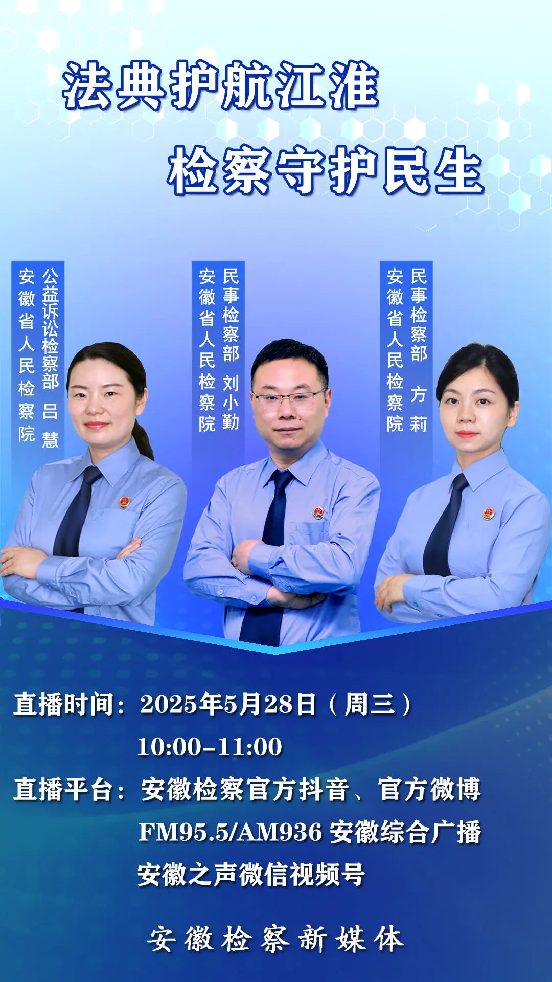 作为安徽省检察院“‘典’亮生活 守护美好”检察开放日活动的一项内容,5月28日上午,安徽省检察院与安徽广播电视台综合广播《法治安徽》节目联合推出“法典护航江淮 检察守护民生”特别直播节目,邀请省检察院民事检察部副主任刘小勤、民事检察部检察官助理方莉、公益诉讼检察部检察官吕慧走进直播间,和听众、网友一起分享安徽省检察机关贯彻实施民法典五年来取得的成效,共同感受法典护航“皖美”生活的检察实践。