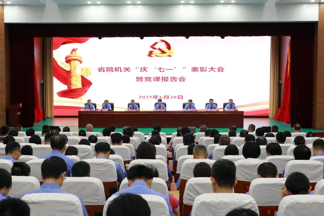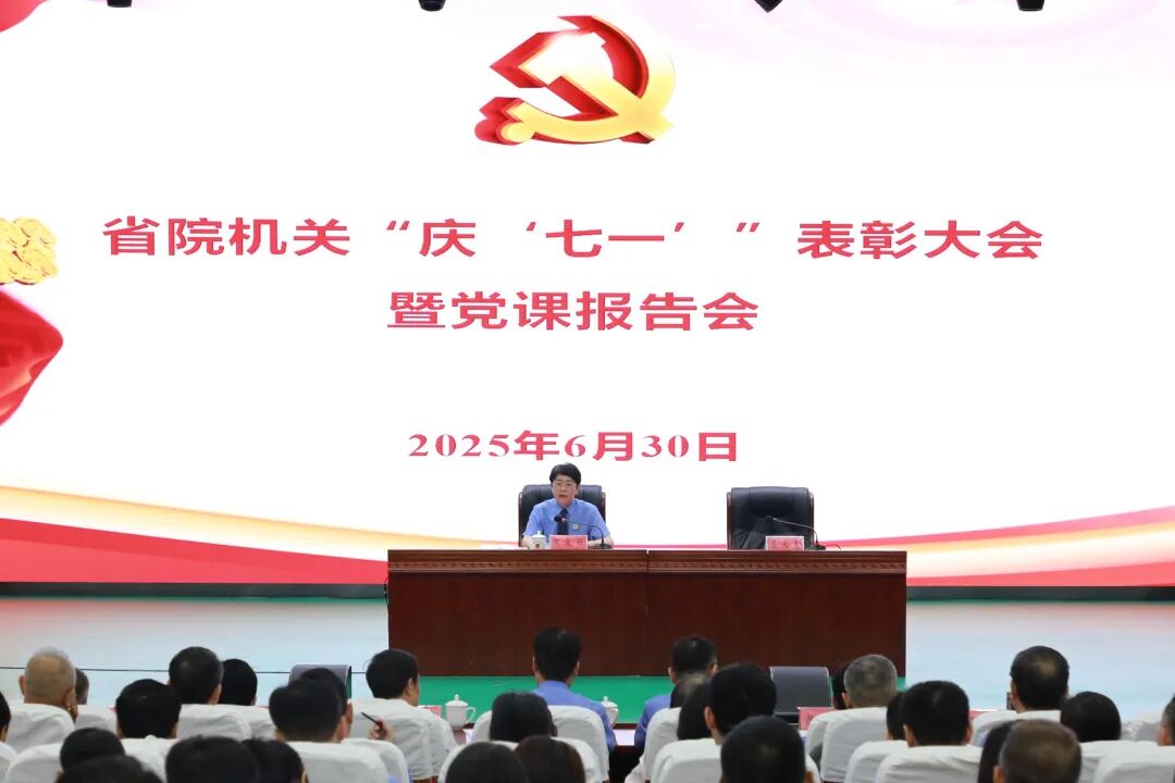 6月30日上午,省检察院召开“庆‘七一’”表彰大会暨党课报告会,为机关光荣在党50年的党员颁发纪念章,表彰2024年度机关“两优一先”、表扬“皖检之星”。安徽省检察院党组书记、检察长宋文娟出席会议,并围绕深入贯彻中央八项规定精神学习教育为机关全体检察人员讲授专题党课。