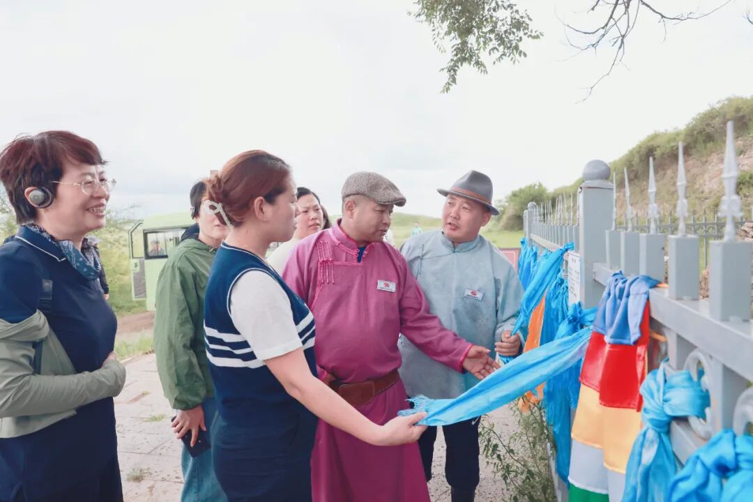 在元上都遗址内的古树前,身着蒙古族服饰的“马背公益守护人”向代表们介绍古树保护情况。