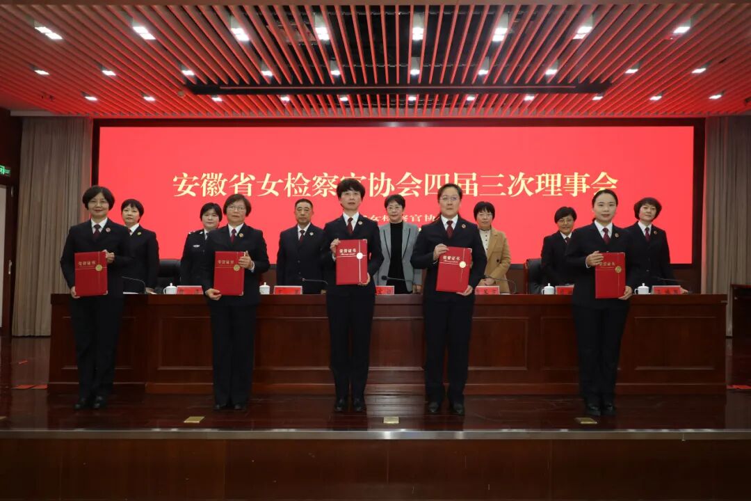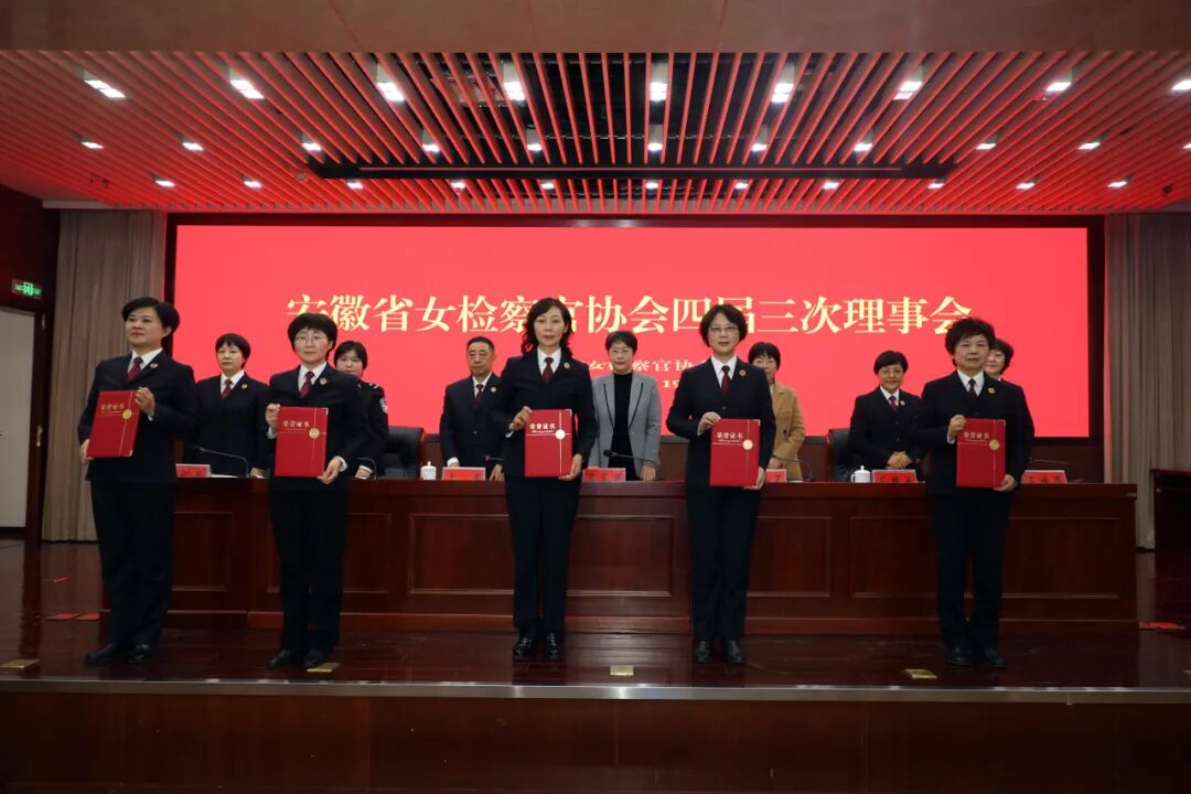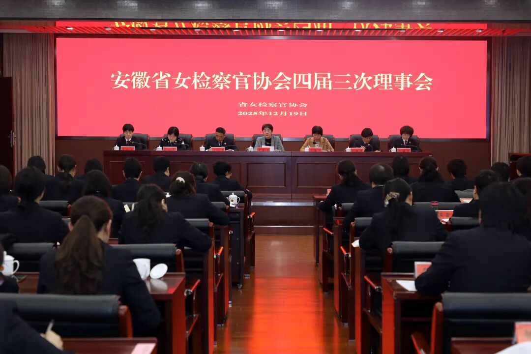 12月19日下午,安徽省女检察官协会召开四届理事会三次会议。会议报告了一年来安徽省女检察官协会工作情况,通报了2025年度安徽省检察机关维护妇女儿童合法权益十大案例并颁奖,增补了协会常务理事、理事。中国女检察官协会副会长,安徽省检察院党组书记、检察长宋文娟,省妇联党组成员、副主席岳军芝出席会议并讲话。安徽省检察院党组成员、政治部主任王勇主持会议。