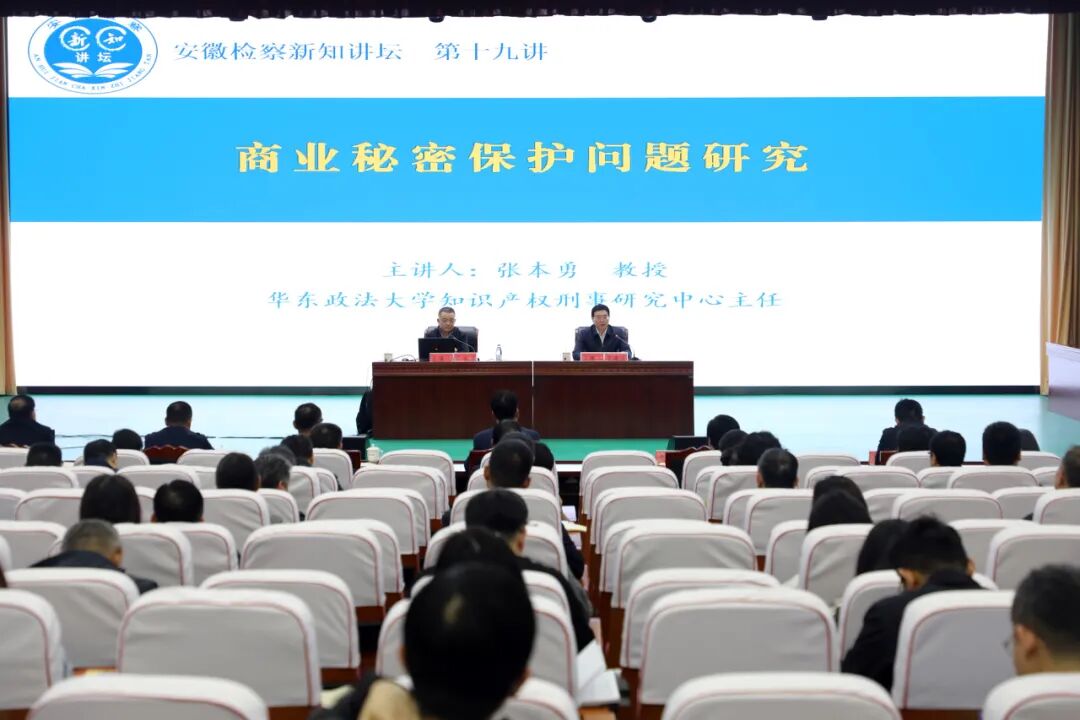 当天下午,根据检校合作安排,华东政法大学知识产权学院教授张本勇受邀参加安徽检察新知讲坛,以“商业秘密保护问题研究”为题,为全省三级院检察干警进行专题授课。省检察院党组成员、副检察长鲁建武主持讲座。