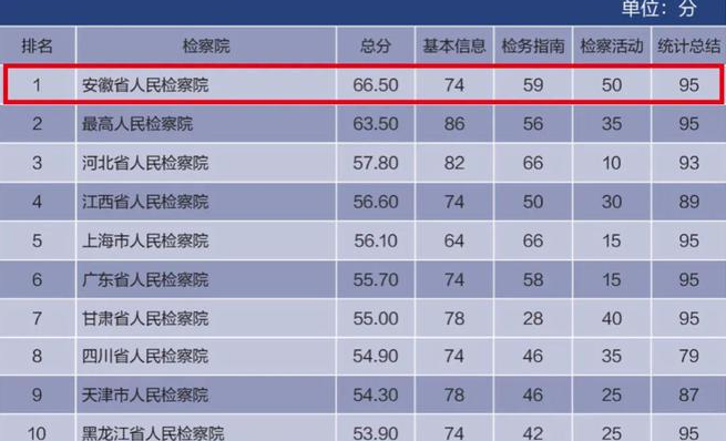 近年来,安徽省检察院检务透明度始终位居全国前列,2018年和2021年,安徽省检察院门户网站检务透明度指数两次夺得全国、省级“双料”第一;2020年在最高检组织的全国检察机关门户网站建设及检务公开情况第三方检查中,夺得第一;2022年被最高检评为“优秀网站单位”。