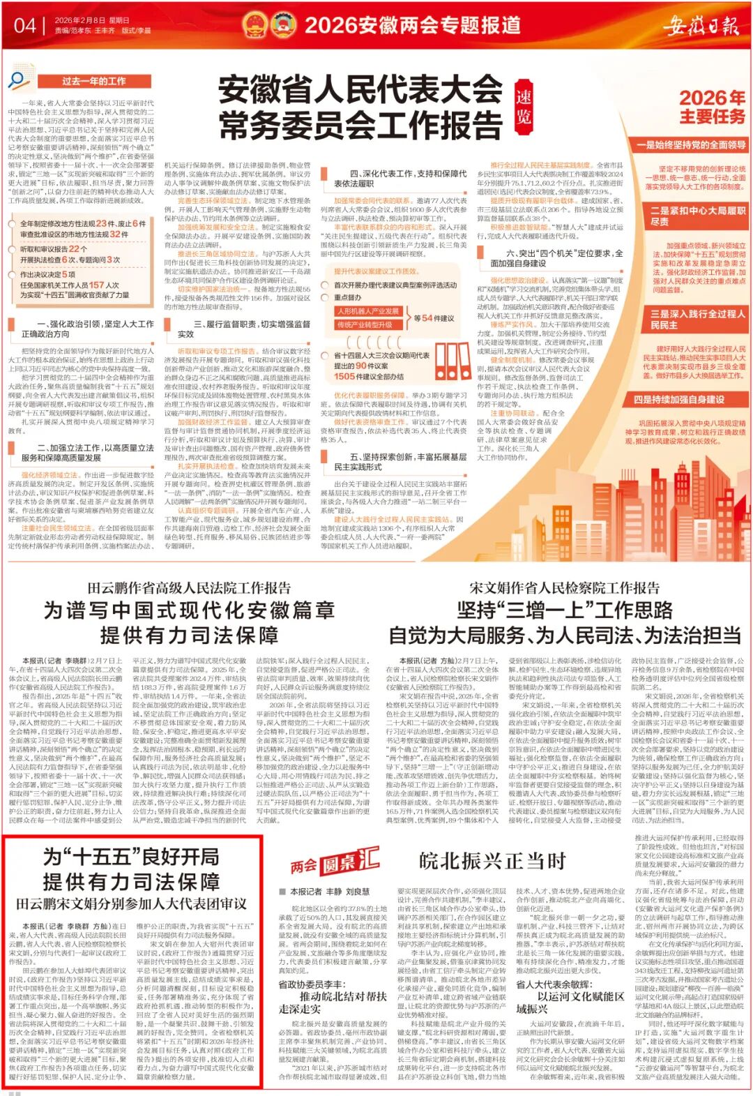 田云鹏在参加人大蚌埠代表团审议时说,《政府工作报告》坚持以习近平新时代中国特色社会主义思想为指导,总结成绩实事求是,目标任务科学合理,部署工作重点突出,是一个高举旗帜、务实担当、凝心聚力、催人奋进的好报告。全省法院将深入贯彻党的二十大和二十届历次全会精神,自觉践行习近平法治思想,全面落实习近平总书记考察安徽重要讲话精神,锚定“三地一区”实现新突破和取得“三个新的更大进展”目标,聚焦《政府工作报告》各项重点任务,切实履行好惩罚犯罪、保护人民、定分止争、维护公正的职责,为我省实现“十五五”良好开局提供有力司法服务保障。