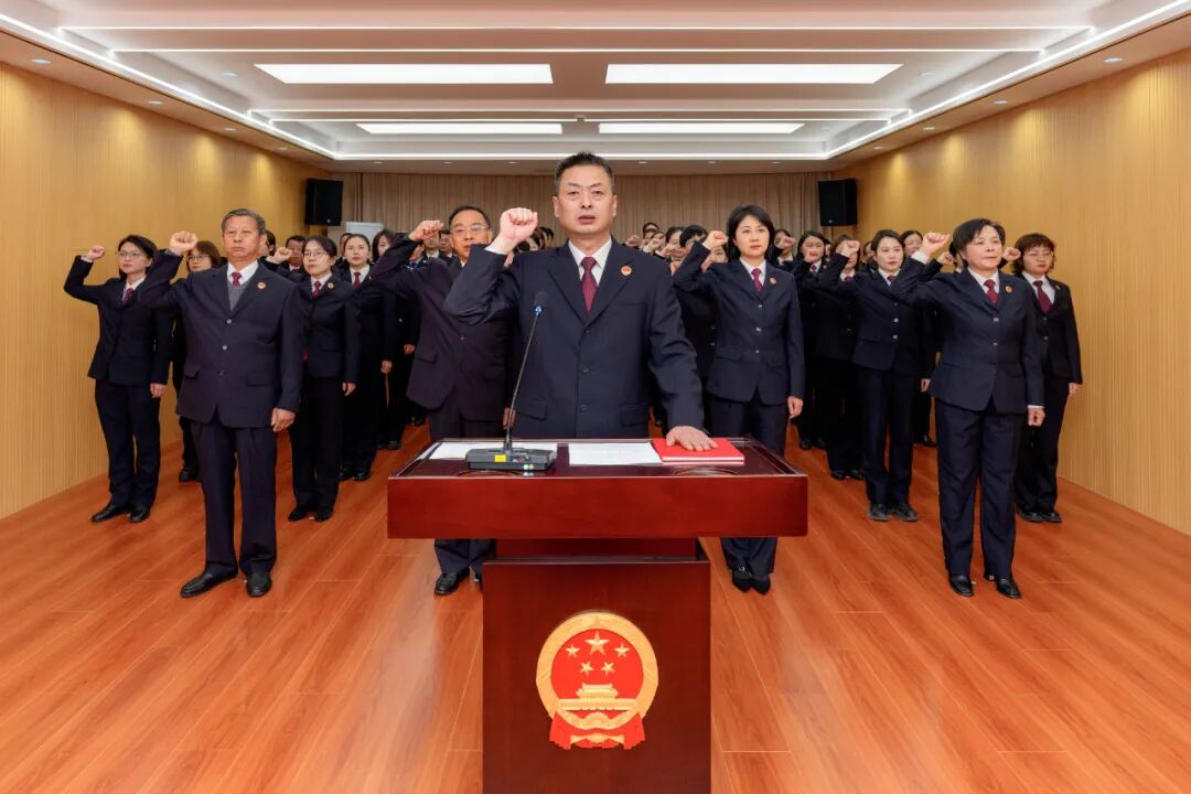 下午3时,会场内国旗鲜红,气氛庄重而神圣。全体人员肃立,奏唱中华人民共和国国歌,嘹亮的歌声拉开仪式序幕。随后,院党组书记、检察长候选人邓言辉举拳领誓,其他宣誓人整齐列队,跟诵誓词。