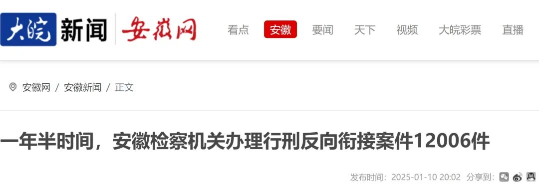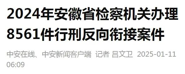 2025年1月10日,安徽省检察院召开新闻发布会。会议通报自2023年7月至2024年12月,全省检察机关行政检察部门共办理行刑反向衔接案件12006件,向有关行政执法机关提出检察意见6505件。