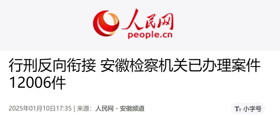2025年1月10日,安徽省检察院召开新闻发布会,2023年7月至2024年12月,全省检察机关行政检察部门共办理行刑反向衔接案件12006件,向有关行政执法机关提出检察意见6505件。