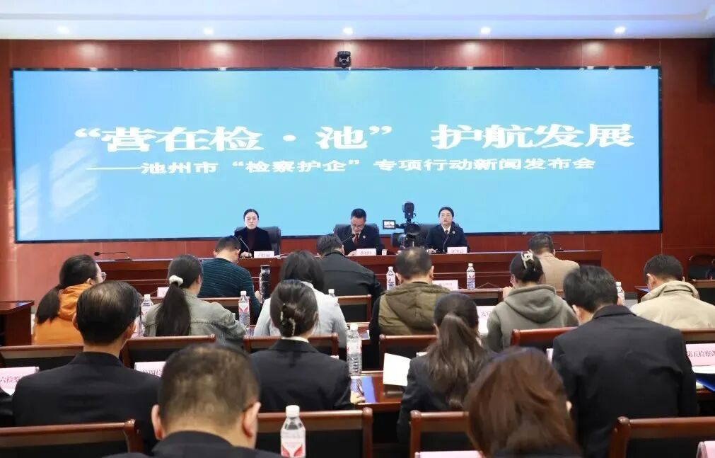 11月12日,池州市人民检察院举办“营在检·池 护航发展”“检察护企”专项行动新闻发布会,通报2024年以来全市检察机关“检察护企”专项行动开展情况,发布相关典型案例,并回答媒体记者提问。安徽日报、中安在线、新安晚报(大皖新闻)、安徽法治报、安徽经济报、皖江晚报、市传媒中心、市政府新闻办等8家新闻媒体应邀参加新闻发布会。