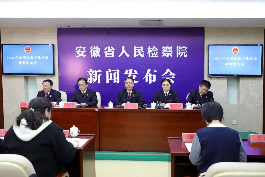 1月17日上午,安徽省检察院召开新闻发布会,通报2024年全省检察工作情况。省检察院党组副书记、副检察长盛大友出席发布会并作相关通报。省检察院新闻发言人、二级巡视员吴贻伙主持发布会。