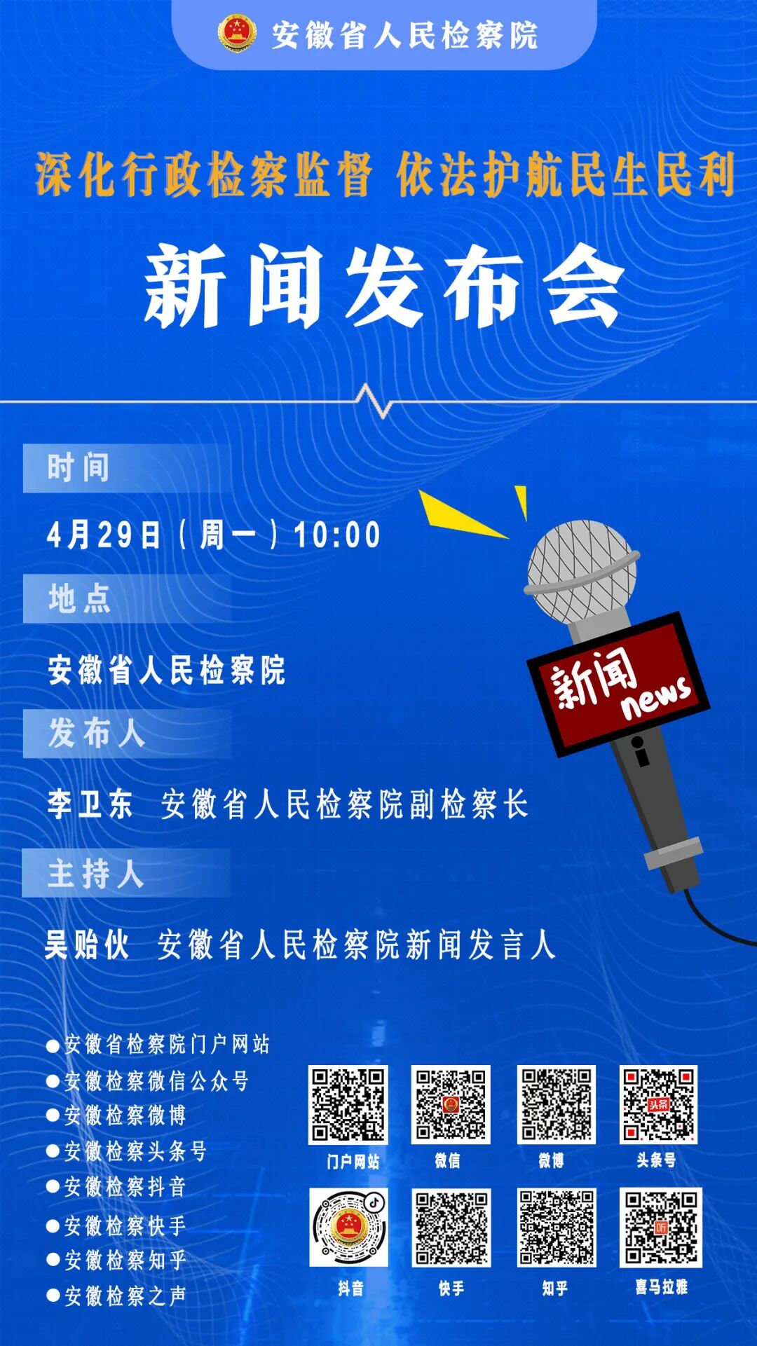 4月29日上午,安徽省检察院将召开新闻发布会,通报全省检察机关全面深化行政检察监督依法护航民生民利专项活动情况,并回答记者提问,敬请关注!