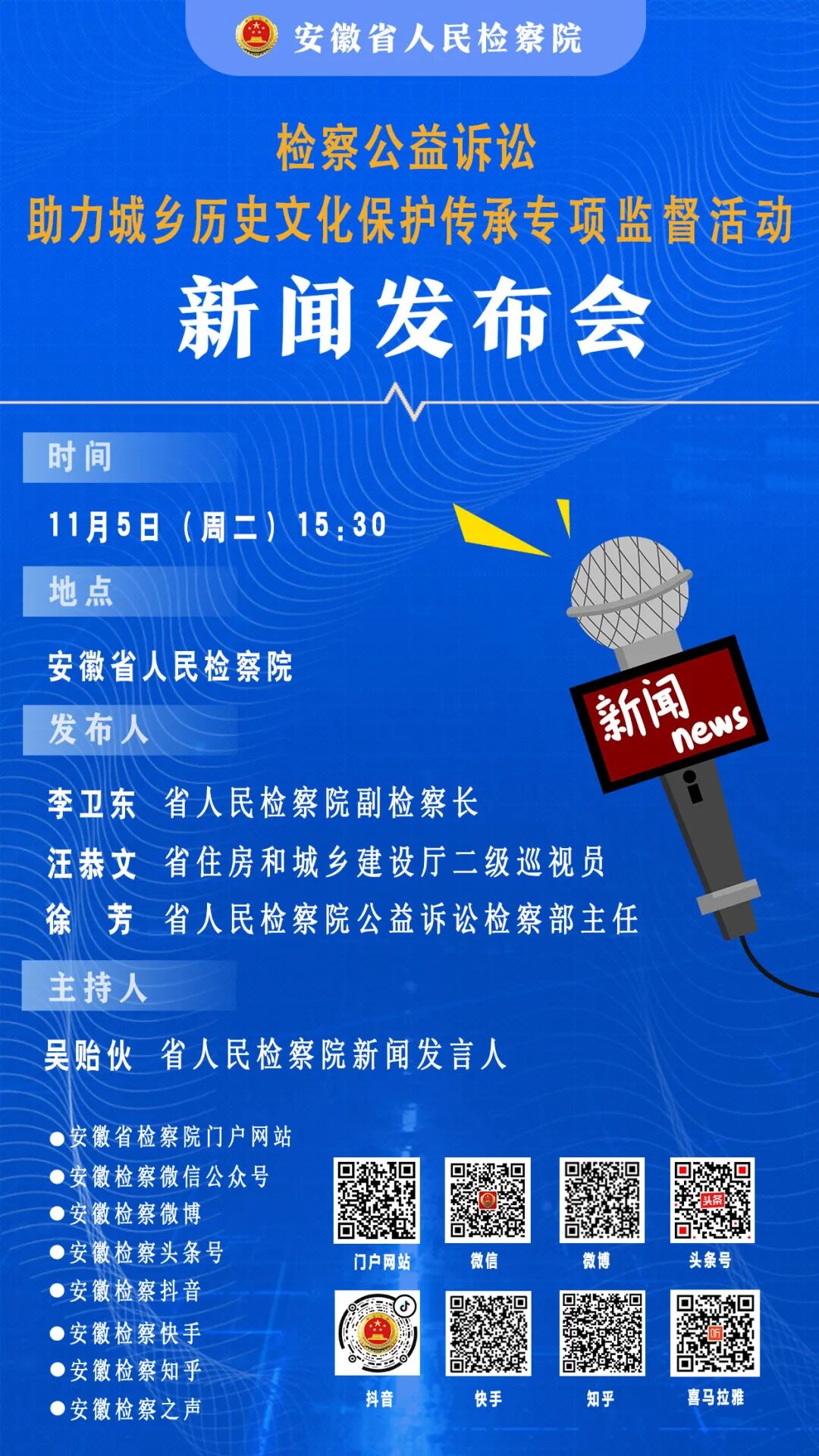 11月5日下午,安徽省人民检察院、省住房和城乡建设厅将举行“检察公益诉讼助力城乡历史文化保护传承”专项监督活动新闻发布会。省人民检察院副检察长李卫东、省住房和城乡建设厅二级巡视员汪恭文出席发布会并通报相关工作情况,发布典型案例。敬请关注!