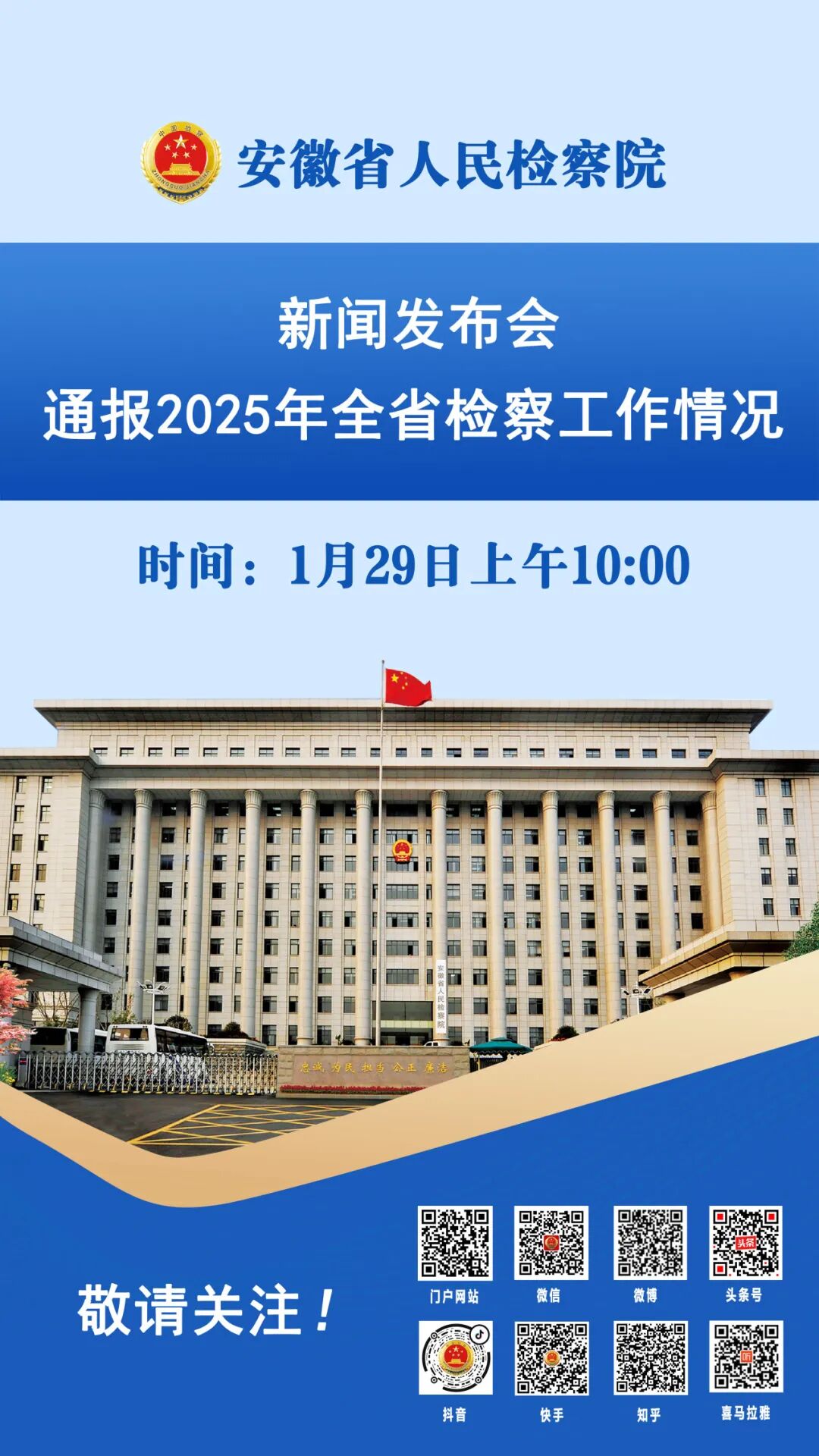 1月29日上午,安徽省检察院将召开新闻发布会,通报2025年全省检察工作情况,并回答记者提问。敬请关注!