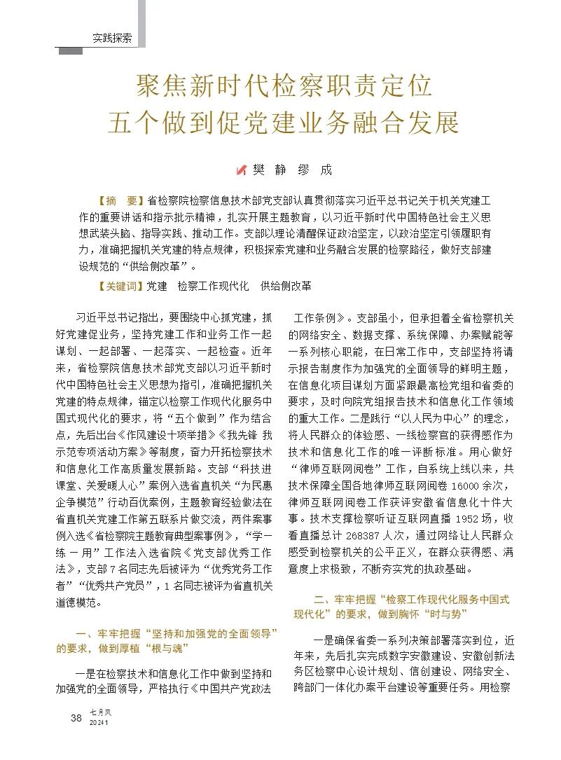 习近平总书记指出,要围绕中心抓党建,抓好党建促业务,坚持党建工作和业务工作一起谋划、一起部署、一起落实、一起检查。近年来,省检察院信息技术部党支部以习近平新时代中国特色社会主义思想为指引,准确把握机关党建的特点规律,锚定以检察工作现代化服务中国式现代化的要求,将“五个做到”作为结合点,先后出台《作风建设十项举措》《我先锋我示范专项活动方案》等制度,奋力开拓检察技术和信息化工作高质量发展新路。支部“科技进课堂、关爱暖人心”案例入选省直机关“为民惠企争模范”行动百优案例,主题教育经验做法在省直机关党建工作第五联系片做交流,两件案事例入选《省检察院主题教育典型案事例》,“学—练—用”工作法入选省院《党支部优秀工作法》,支部7名同志先后被评为“优秀党务工作者”“优秀共产党员”,1名同志被评为省直机关道德模范。