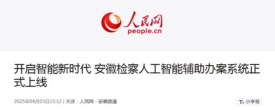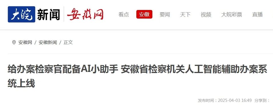 4月3日,安徽省检察院人工智能辅助办案系统上线,这是全国检察机关首个全省上线使用,利用基础性、主干性智能化基座研发的人工智能辅助办案系统。最高人民检察院副检察长张雪樵出席上线仪式并强调,全国检察机关要坚持以习近平法治思想为引领,践行高质效办好每一个案件的价值目标,着力推动检察机关智能化应用创新。