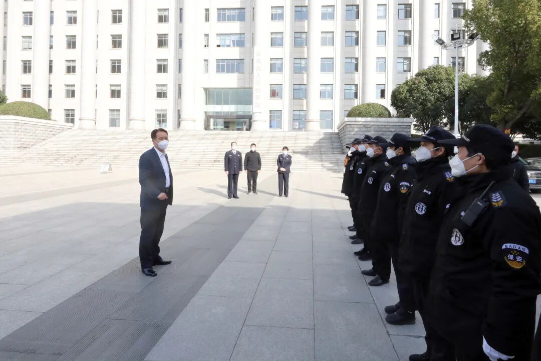 在机关南大门,盛大友与安保人员一一握手,感谢他们在过去的一年坚守岗位,认真履职,以高度的责任感与拼搏精神,圆满完成了机关党的二十大期间安保维稳政治任务,日常安全保卫基本任务以及信访维稳特殊任务。“‘温暖控申’亮面建设‘431’行动获评省2022年度十大法治事件,你们是幕后英雄,军功章也有你们的一半。”