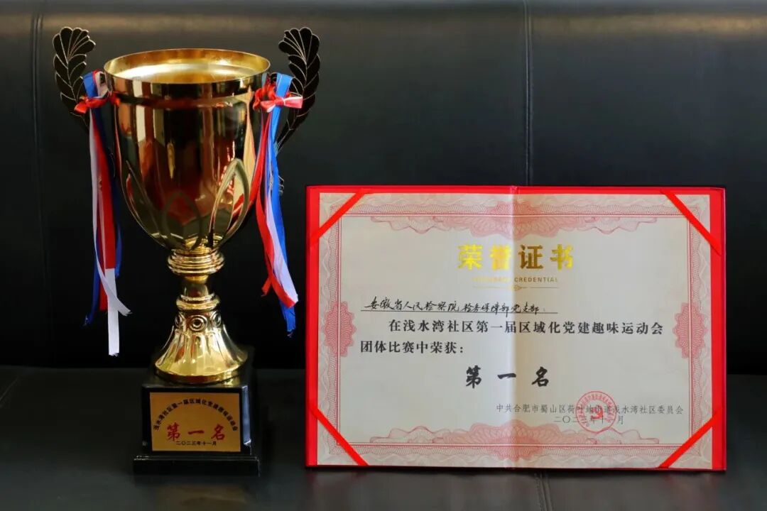 ▲在合肥市荷叶地街道浅水湾社区第一届区域化党建趣味运动会团体比赛中,省检察院检务保障部党支部代表队获第一名。