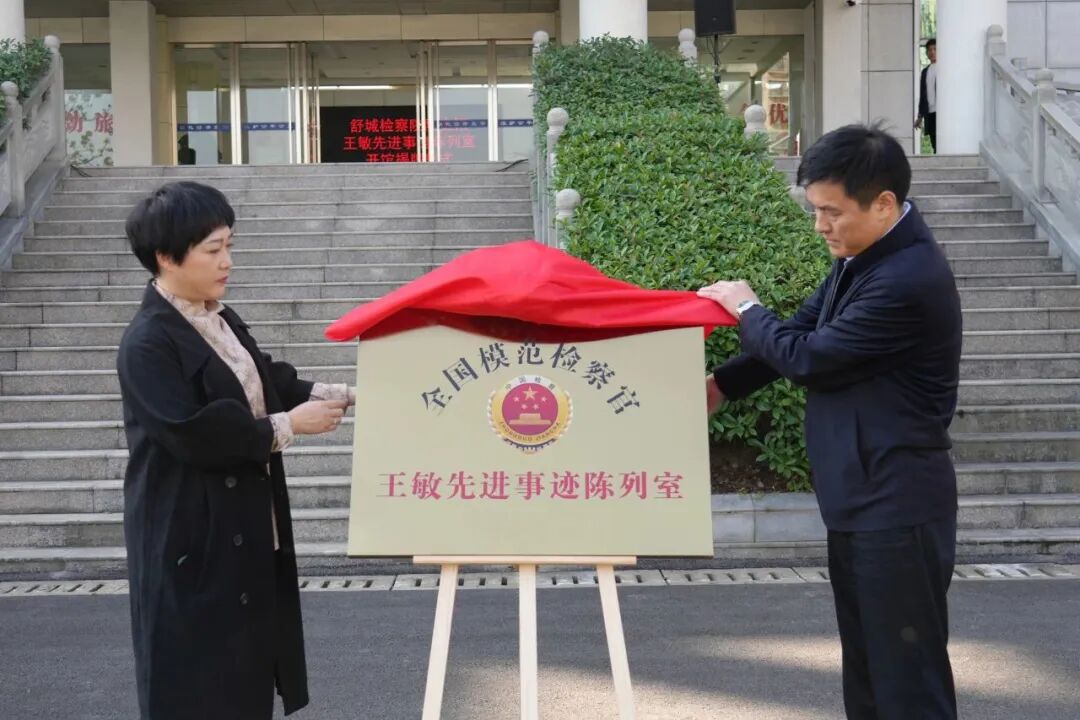 ▲舒城县委常委、政法委书记郑文(右),王敏同志家属(左)为王敏先进事迹陈列室揭牌。