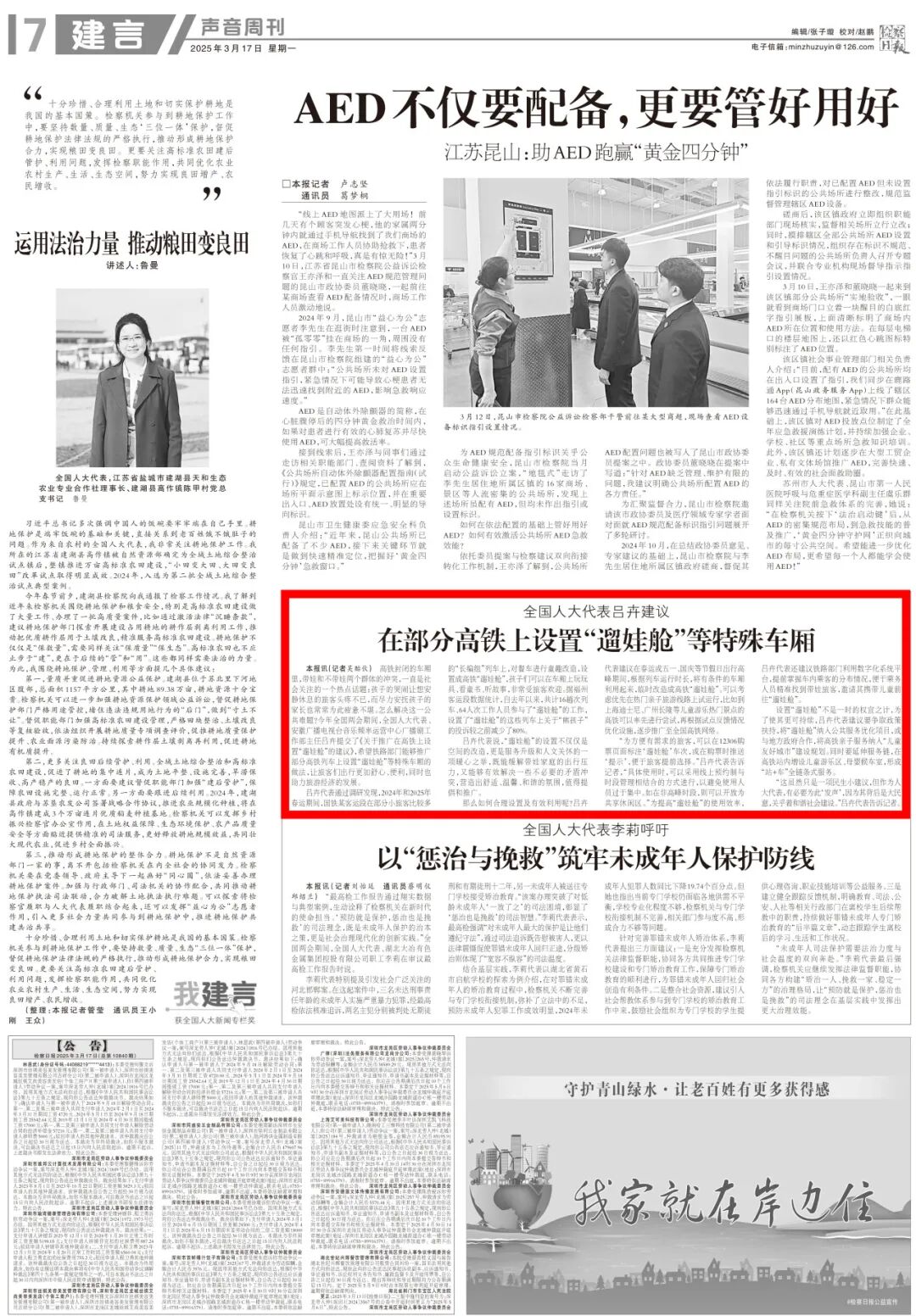 吕卉代表通过调研发现,2024年和2025年春运期间,国铁某客运段在部分小旅客比较多的“长编组”列车上,对餐车进行童趣改造,设置成高铁“遛娃舱”,孩子们可以在车厢上玩玩具、看童书、听故事,非常受旅客欢迎。据福州客运段数据统计,自去年以来,共计16趟次列车、64人次工作人员参与了“遛娃舱”的工作,设置了“遛娃舱”的这些列车上关于“熊孩子”的投诉较之前减少了80%。