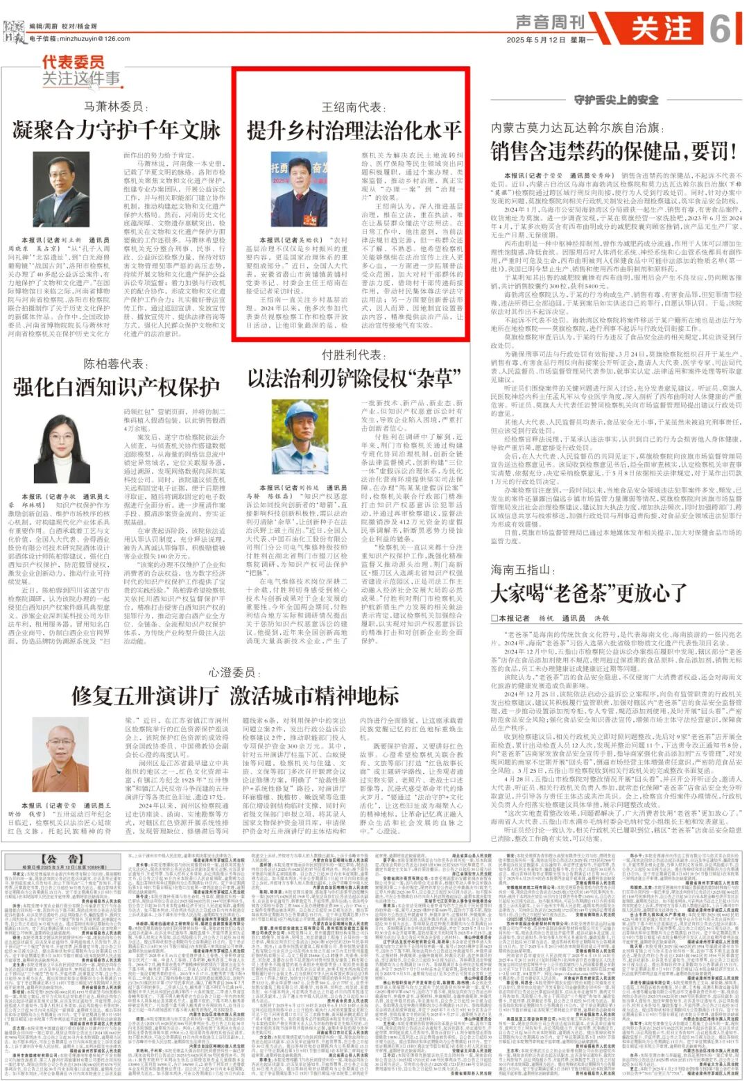 王绍南一直关注乡村基层治理。2024年以来,他多次参加代表委员视察检察工作和检察开放日活动,让他印象最深的是,检察机关为解决农民土地流转纠纷、医疗保险等民生领域突出问题积极履职,通过个案办理、类案监督,推动乡村治理,真正实现从“办理一案”到“治理一片”的效果。