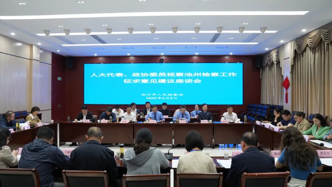 5月8日,实地视察结束后,代表委员征求意见建议座谈会在池州市检察院召开,会议由李卫东主持。会上,陈勇向代表委员介绍了池州检察工作总体情况。省检察院行政检察部主任张克德介绍了行政检察工作职能,以及全省行政检察发展概况。