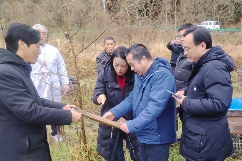 ▲张莉代表(中)与相关专家在安徽省歙县调研蜜蜂养殖情况。