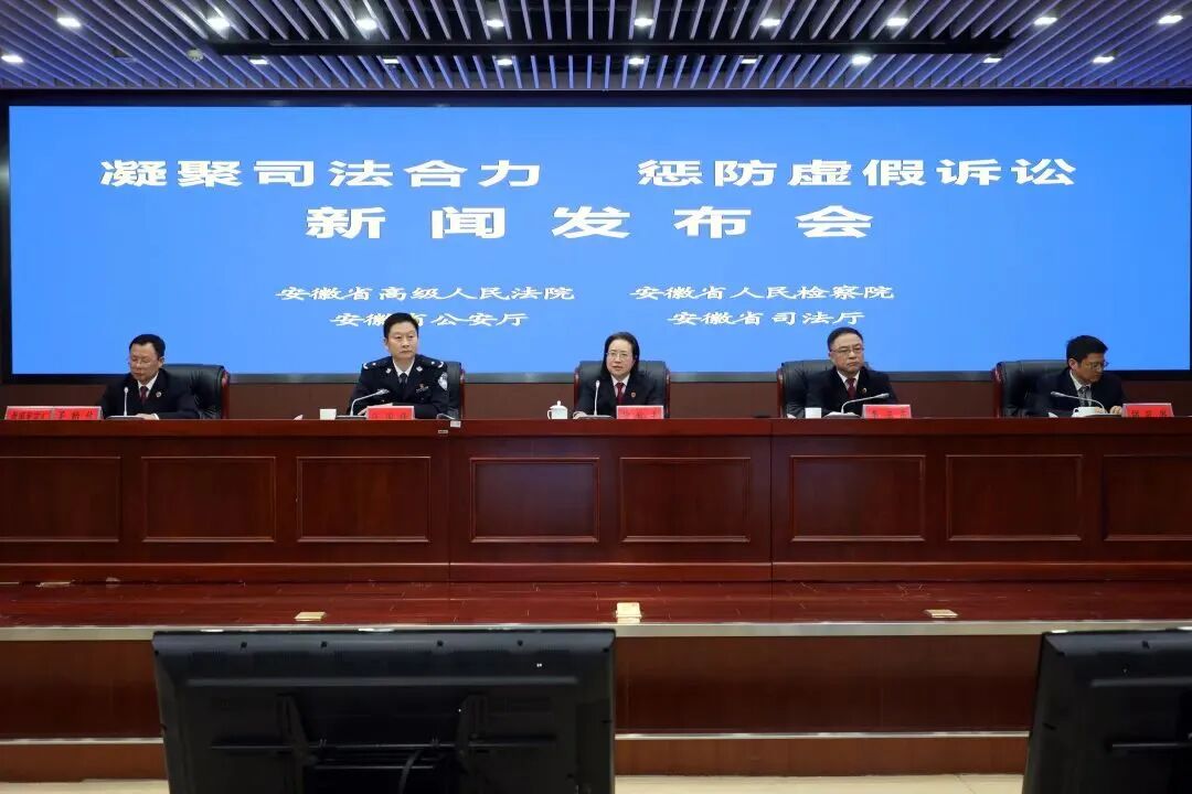 ▲2021年10月20日,安徽省检察院联合省高级法院、省公安厅、省司法厅召开新闻发布会,公布四家会签的《关于防范和惩治虚假诉讼的工作指南》(以下简称《指南》),并对联合开展打击虚假诉讼专项活动进行动员部署。