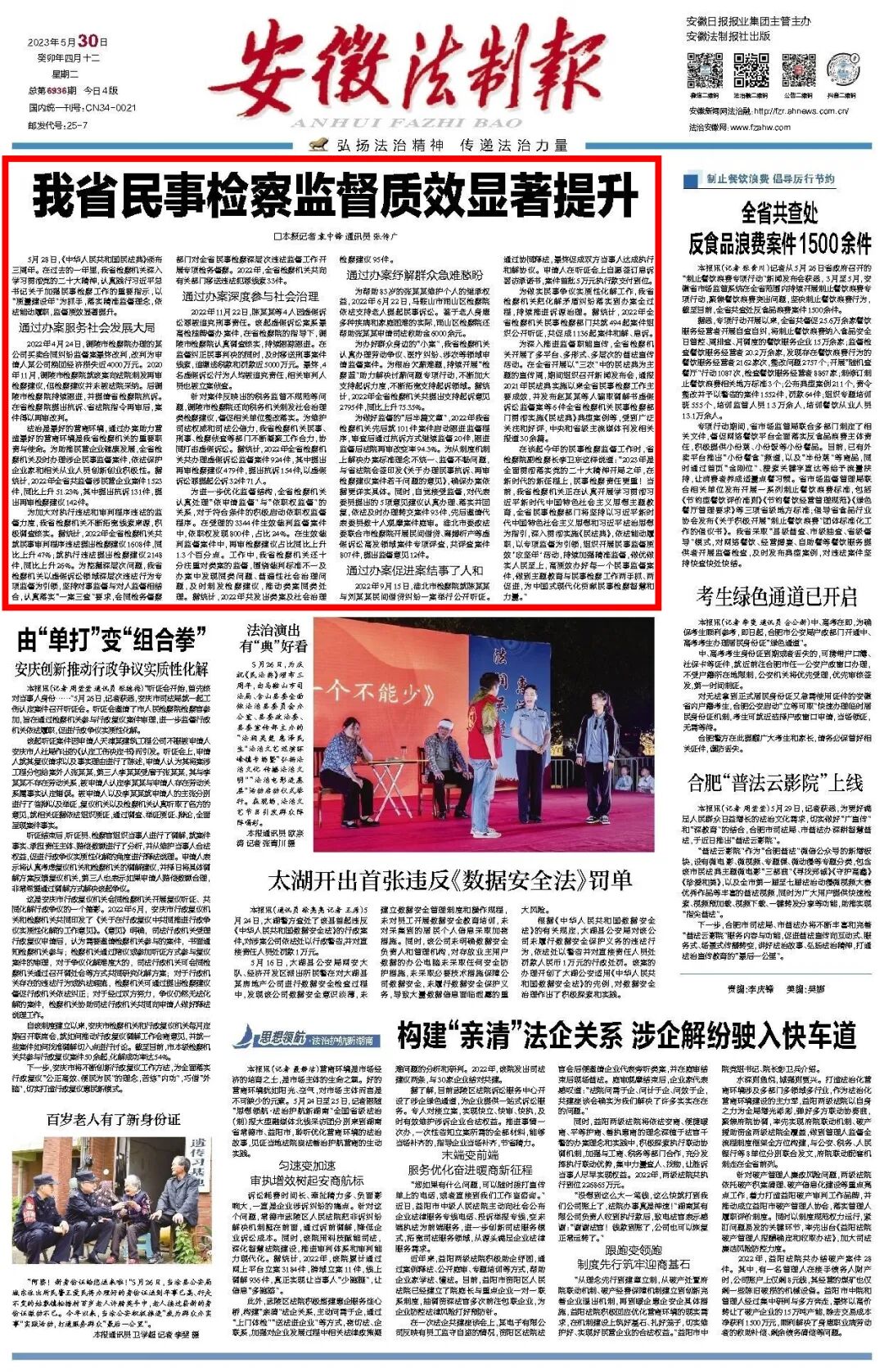 2023年5月30日《安徽法制报》头版头条